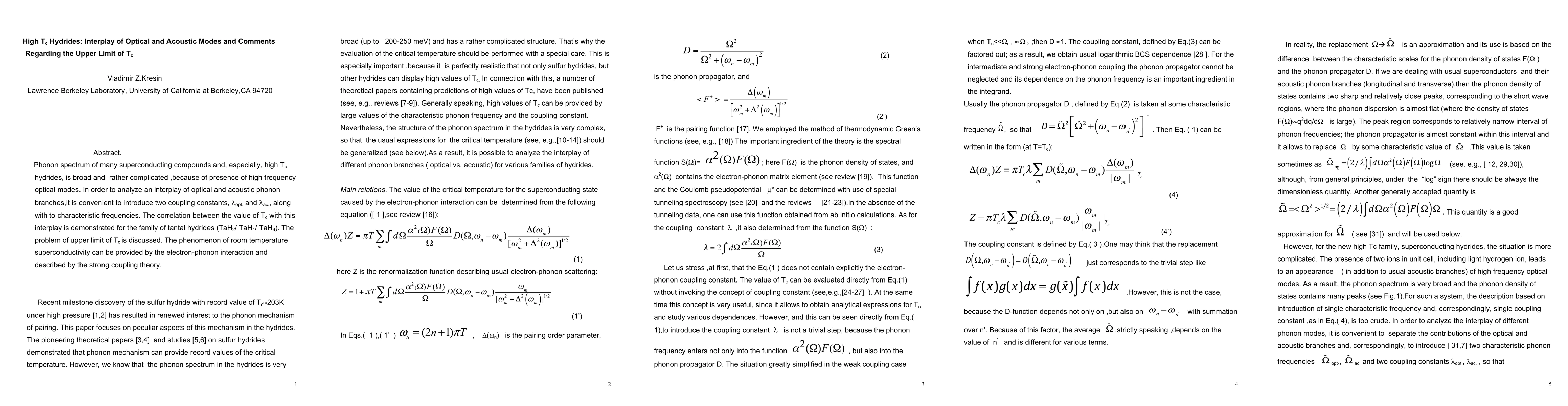Phonon spectrum of many superconducting compounds and, especially, high Tc hydrides, is broad and rather complicated ,because of presence of high frequency optical modes. In order to analyze an interplay of optical and acoustic phonon branches,it is convenient to introduce two coupling constants, {\lambda}opt. and {\lambda}ac., along with to characteristic frequencies. The correlation between the value of Tc with this interplay is demonstrated for the family of tantal hydrides (TaH2/ TaH4/ TaH6). The problem of upper limit of Tc is discussed. The phenomenon of room temperature superconductivity can be provided by the electron-phonon interaction and described by the strong coupling theory.
