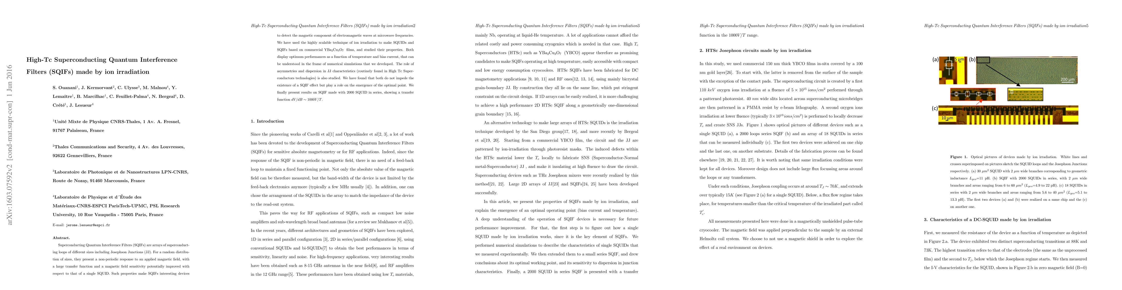 Superconducting Quantum Interference Filters (SQIFs) are arrays of superconducting loops of different sizes including Josephson Junctions (JJ). For a random distribution of sizes, they present a non-periodic response to an applied magnetic field, with an extended linear regime and a sizable field sensitivity. Such properties make SQIFs interesting devices to detect the magnetic component of electromagnetic waves at microwave frequencies. We have used the highly scalable technique of ion irradiation to make High Tc SQUIDs and SQIFs based on commercial YBa2Cu3O7 films, and studied their properties. Both display optimum performances as a function of temperature and bias current, that can be understood in the frame of numerical simulations that we developed. The role of asymmetries and spread in JJ characteristics (routinely found in HTSc technologies) is described : ion irradiation based devices appear robust against them. We finally present results on SQIF made with 2000 SQUID in series, showing a transfer function dV/dB ~ 1000V/T .