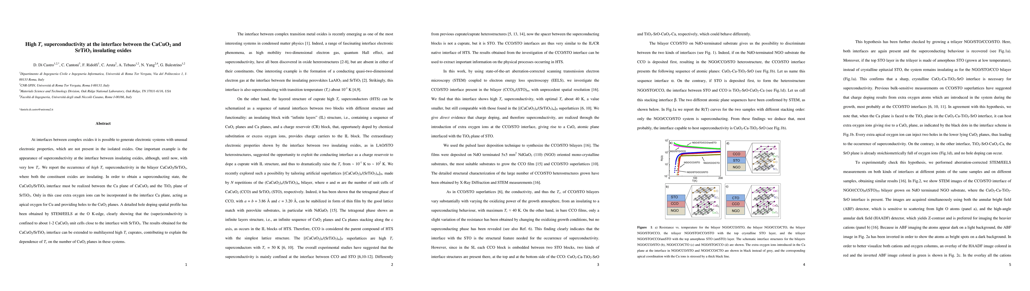 At interfaces between complex oxides it is possible to generate electronic systems with unusual electronic properties, which are not present in the isolated oxides. One important example is the appearance of superconductivity at the interface between insulating oxides, although, until now, with very low Tc. We report the occurrence of high Tc superconductivity in the bilayer CaCuO2/SrTiO3, where both the constituent oxides are insulating. In order to obtain a superconducting state, the CaCuO2/SrTiO3 interface must be realized between the Ca plane of CaCuO2 and the TiO2 plane of SrTiO3. Only in this case extra oxygen ions can be incorporated in the interface Ca plane, acting as apical oxygen for Cu and providing holes to the CuO2 planes. A detailed hole doping spatial profile has been obtained by STEM/EELS at the O K-edge, clearly showing that the (super)conductivity is confined to about 1-2 CaCuO2 unit cells close to the interface with SrTiO3. The results obtained for the CaCuO2/SrTiO3 interface can be extended to multilayered high Tc cuprates, contributing to explain the dependence of Tc on the number of CuO2 planes in these systems.