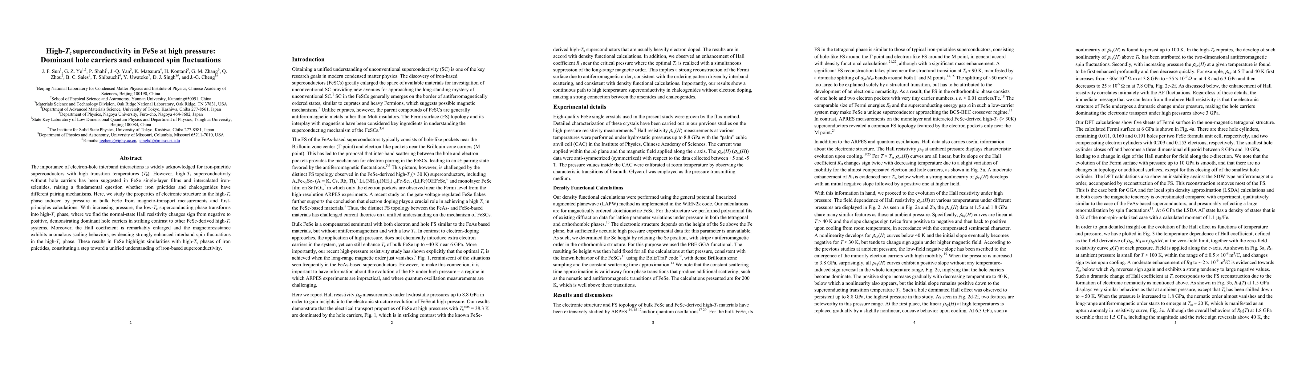 The importance of electron-hole interband interactions is widely acknowledged for iron-pnictide superconductors with high transition temperatures (Tc). However, high-Tc superconductivity without hole carriers has been suggested in FeSe single-layer films and intercalated iron-selenides, raising a fundamental question whether iron pnictides and chalcogenides have different pairing mechanisms. Here, we study the properties of electronic structure in the high-Tc phase induced by pressure in bulk FeSe from magneto-transport measurements and first-principles calculations. With increasing pressure, the low-Tc superconducting phase transforms into high-Tc phase, where we find the normal-state Hall resistivity changes sign from negative to positive, demonstrating dominant hole carriers in striking contrast to other FeSe-derived high-Tc systems. Moreover, the Hall coefficient is remarkably enlarged and the magnetoresistance exhibits anomalous scaling behaviors, evidencing strongly enhanced interband spin fluctuations in the high-Tc phase. These results in FeSe highlight similarities with high-Tc phases of iron pnictides, constituting a step toward a unified understanding of iron-based superconductivity.