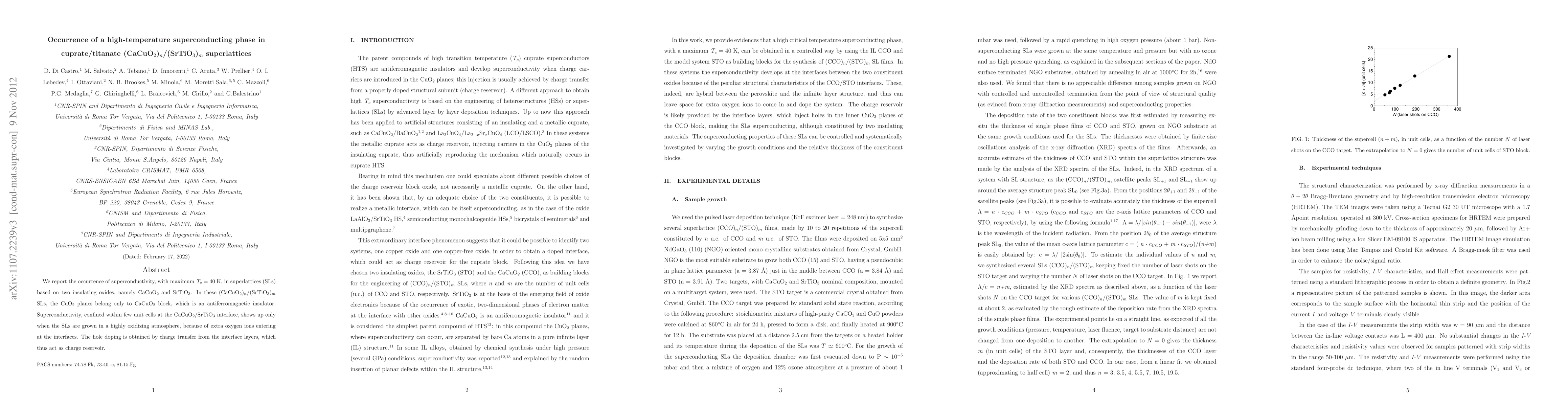 We report the occurrence of superconductivity, with maximum Tc = 40 K, in superlattices (SLs) based on two insulating oxides, namely CaCuO2 and SrTiO3. In these (CaCuO2)n/(SrTiO3)m SLs, the CuO2 planes belong only to CaCuO2 block, which is an antiferromagnetic insulator. Superconductivity, confined within few unit cells at the CaCuO2/SrTiO3 interface, shows up only when the SLs are grown in a highly oxidizing atmosphere, because of extra oxygen ions entering at the interfaces. Evidence is reported that the hole doping of the CuO2 planes is obtained by charge transfer from the interface layers, which act as charge reservoir.