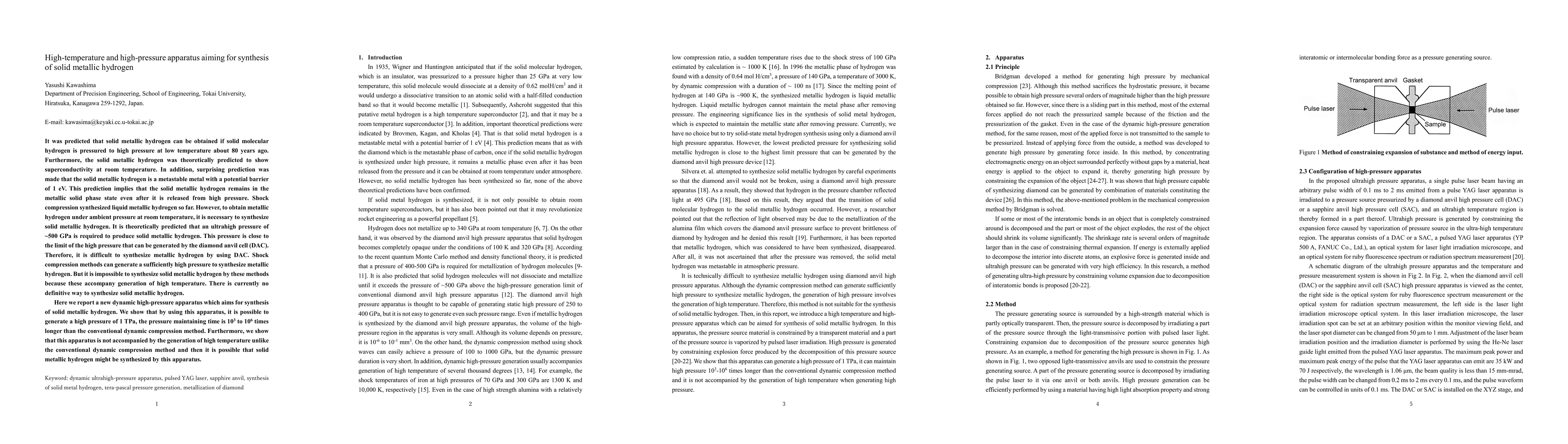 This paper introduces a new high-pressure apparatus designed to synthesize solid metallic hydrogen, which is predicted to exhibit superconductivity at room temperature. The new apparatus can generate pressures up to 1 TPa without generating high temperatures, potentially enabling the synthesis of solid metallic hydrogen under conditions that previous methods could not achieve.