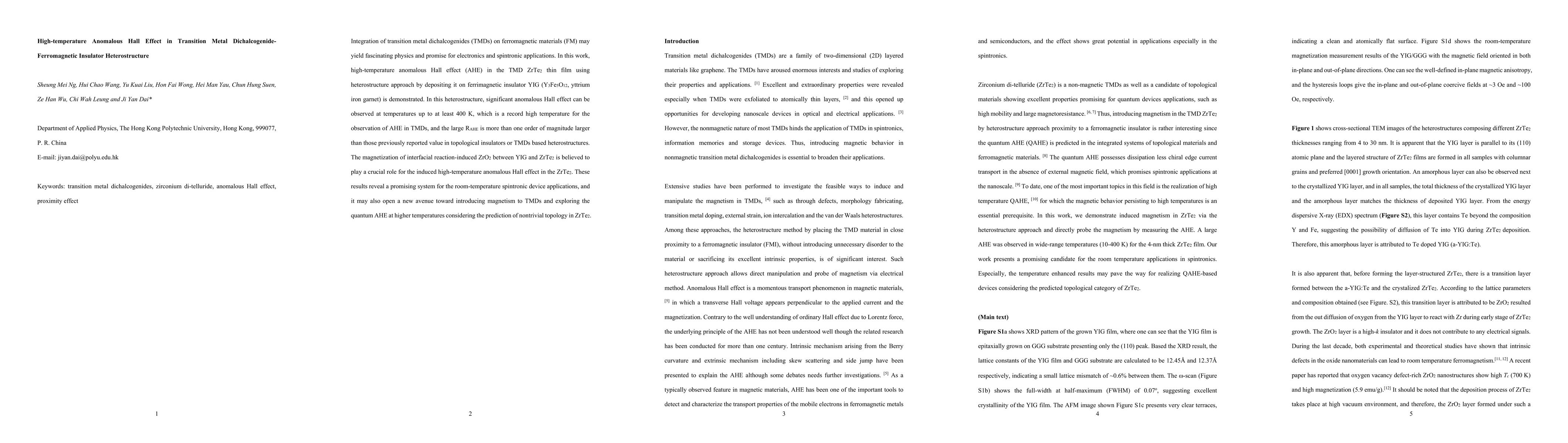 This paper demonstrates the high-temperature anomalous Hall effect (AHE) in a ZrTe2 thin film on a ferrimagnetic insulator YIG heterostructure, achieving significant AHE up to 400 K, a record high for TMDs. The large AHE is attributed to interfacial ZrO2 magnetization, suggesting potential for room-temperature spintronic applications.