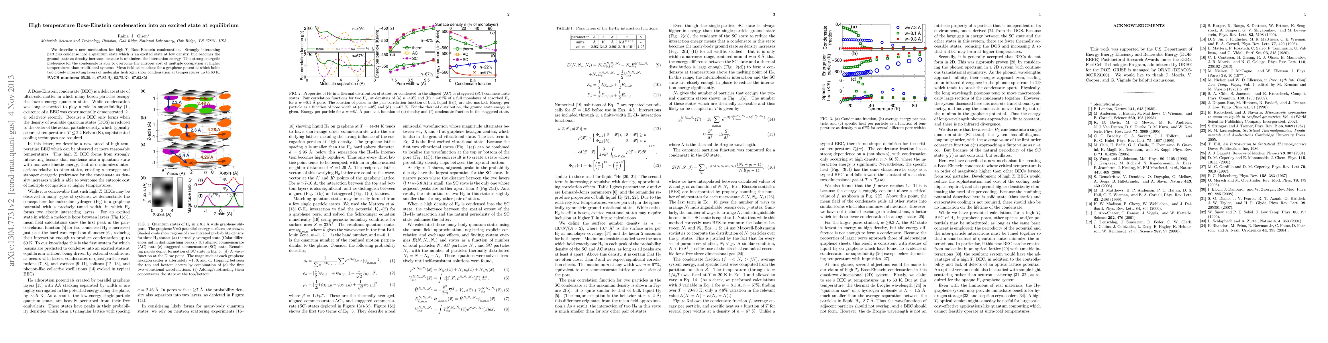 We describe Bose-Einstein condensation of strongly interacting particles into a quantum state which is an excited single-particle state, but becomes the ground state as density increases because it minimizes the interaction energy compared to other states. Mean field calculations for a graphene potential just wide enough for two closely interacting layers of molecular hydrogen show condensation at temperatures up to 60 K. In the condensed state, molecules hop between layers, increasing the first peak in the pair-correlation function just past the hard core repulsion diameter.