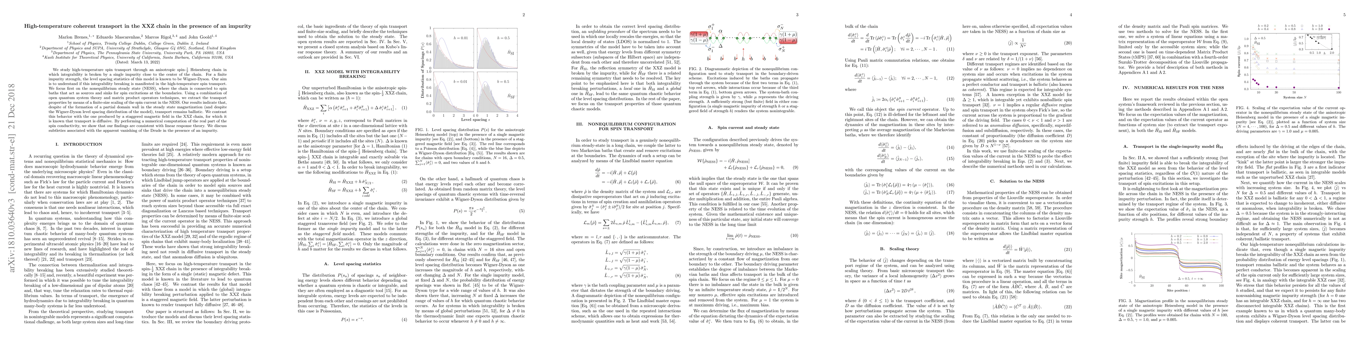We study high-temperature spin transport through an anisotropic spin-1/2 Heisenberg chain in which integrability is broken by a single impurity close to the center of the chain. For a finite impurity strength, the level spacing statistics of this model is known to be Wigner-Dyson. Our aim is to understand if this integrability breaking is manifested in the high-temperature spin transport. We focus first on the nonequilibrium steady state (NESS), where the chain is connected to spin baths that act as sources and sinks for spin excitations at the boundaries. Using a combination of open quantum system theory and matrix product operators techniques, we extract the transport properties by means of a finite-size scaling of the spin current in the NESS. Our results indicate that, despite the formation of a partial domain wall in the steady state magnetization (and despite the Wigner-Dyson level spacing distribution of the model), transport remains ballistic. We contrast this behavior with the one produced by a staggered magnetic field in the XXZ chain, for which it is known that transport is diffusive. By performing a numerical computation of the real part of the spin conductivity, we show that our findings are consistent with linear response theory. We discuss subtleties associated with the apparent vanishing of the Drude in the presence of an impurity.