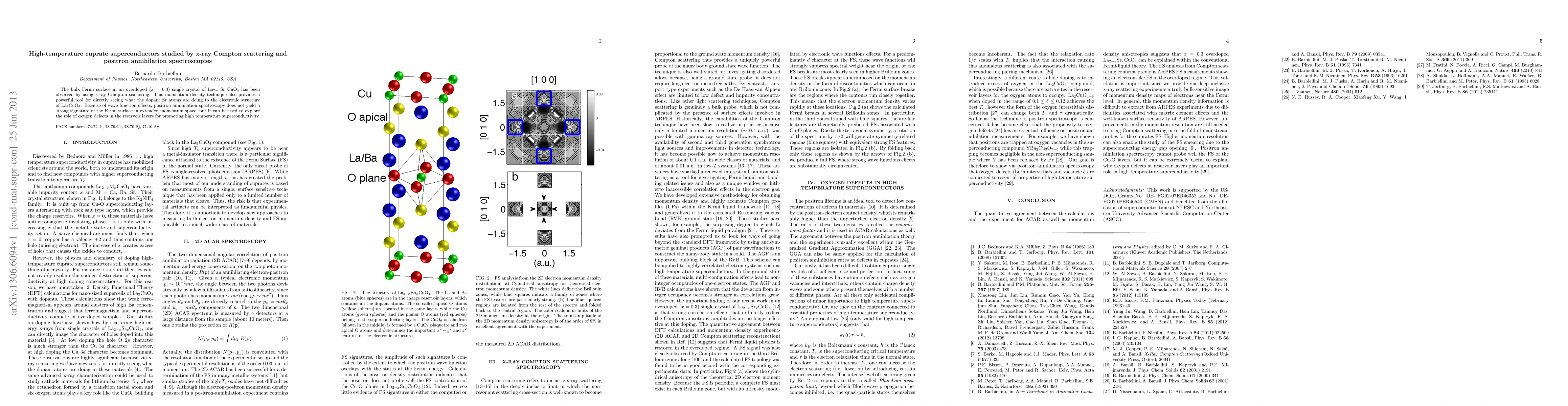 This study uses x-ray Compton scattering to observe the bulk Fermi surface in overdoped La$_{2-x}$Sr$_{x}$CuO$_{4}$ and investigates how Sr doping affects the electronic structure. Positron annihilation spectroscopy is employed to examine the influence of oxygen defects in the reservoir layers on high-temperature superconductivity.