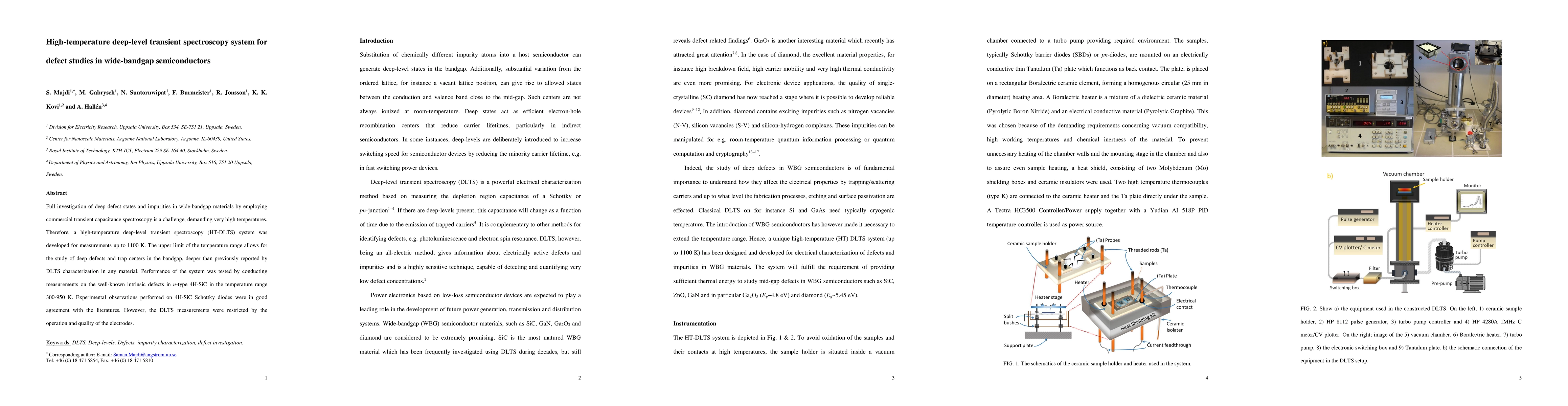 This paper details the development of a high-temperature deep-level transient spectroscopy (HT-DLTS) system capable of measuring up to 1100 K, enabling the study of deep defect states in wide-bandgap semiconductors. The system was tested on n-type 4H-SiC, showing good agreement with literature but highlighting limitations due to electrode quality.