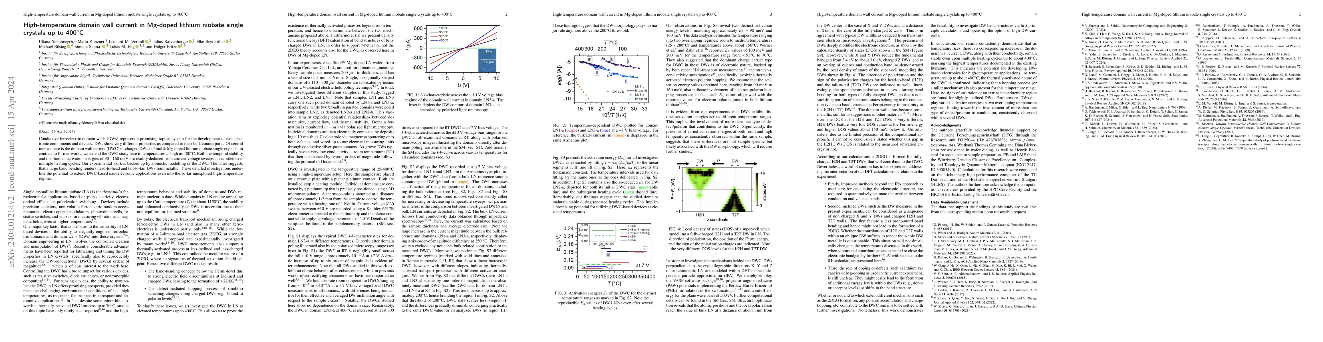 This paper investigates the high-temperature domain wall current in Mg-doped lithium niobate crystals, extending measurements up to 400°C and revealing thermal activation energies between 90-160 meV. Atomistic modeling supports findings that large band bending makes domain walls semimetallic, highlighting the potential for advanced nanoelectronic applications.