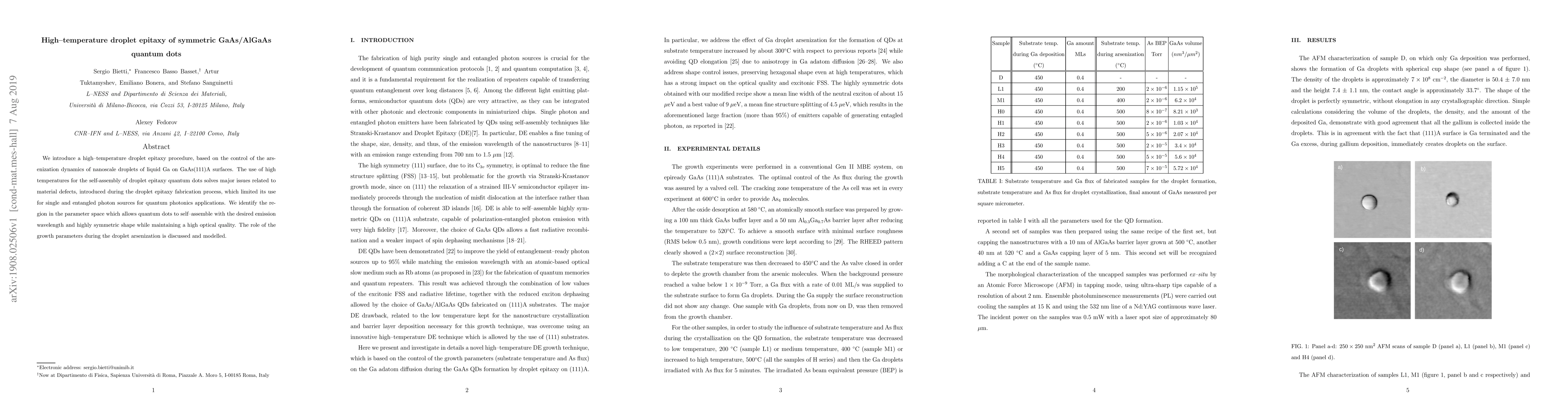 This paper presents a high-temperature droplet epitaxy method for creating symmetric GaAs/AlGaAs quantum dots, addressing material defect issues and achieving self-assembly with desired emission and symmetry for quantum photonics. The study identifies optimal growth parameters for high optical quality.