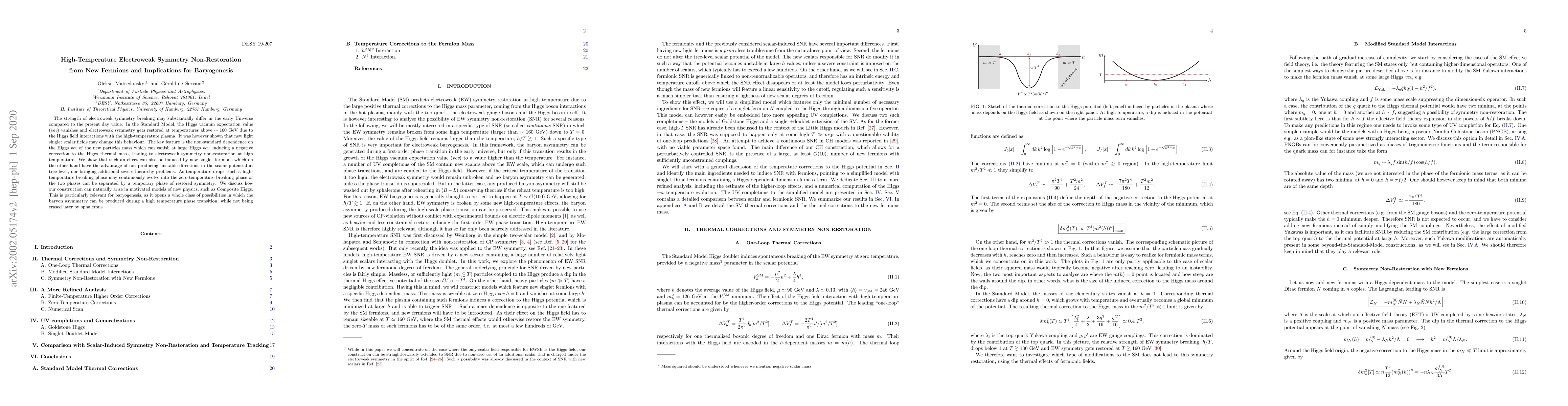 This paper explores the possibility of high-temperature electroweak symmetry non-restoration driven by new singlet fermions, which avoids the hierarchy problems of scalar fields. It discusses the implications for baryogenesis, suggesting that such a phase transition could generate baryon asymmetry without being erased by sphalerons.