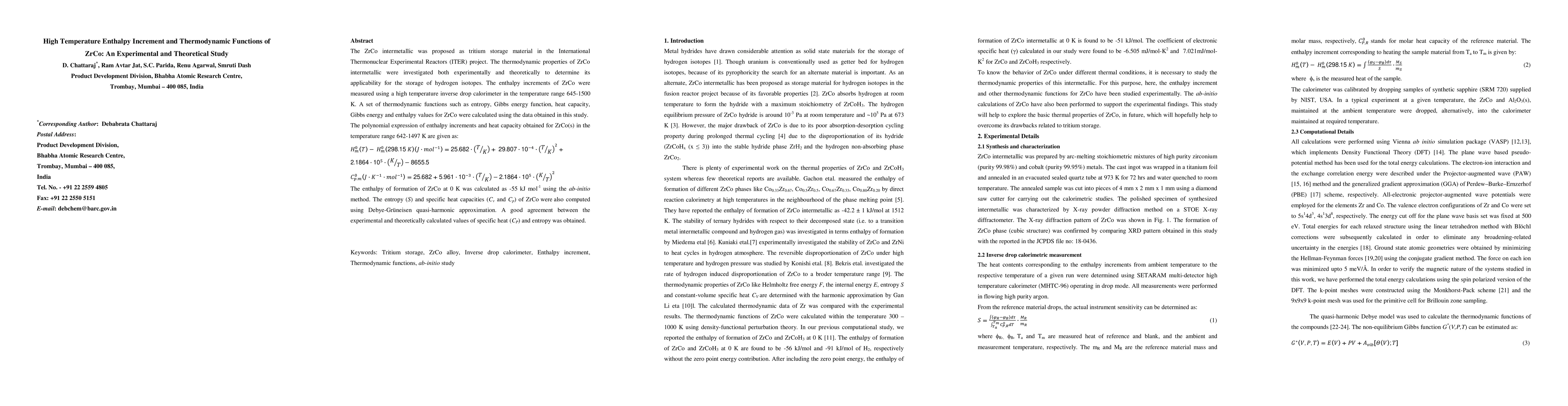 This study experimentally and theoretically investigates the thermodynamic properties of ZrCo, a proposed tritium storage material for ITER. Enthalpy increments and thermodynamic functions were calculated using high-temperature calorimetry and ab-initio methods, showing good agreement between experimental and theoretical values.