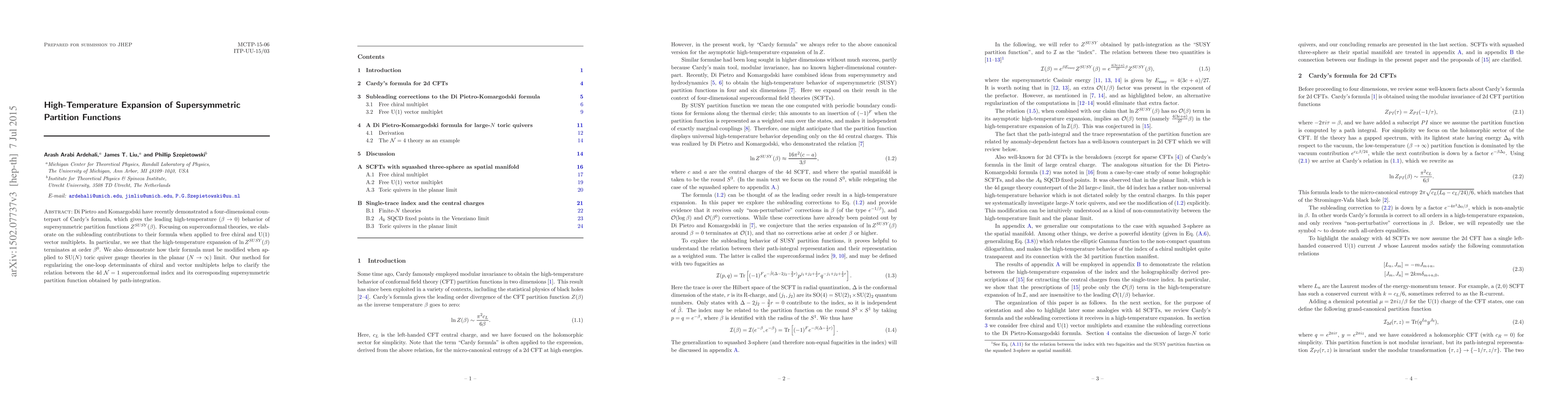 This paper explores the high-temperature expansion of supersymmetric partition functions in four dimensions, focusing on subleading contributions to the formula for free chiral and U(1) vector multiplets. It also modifies the formula for SU($N$) toric quiver gauge theories in the planar limit, clarifying the relation between the superconformal index and the supersymmetric partition function.