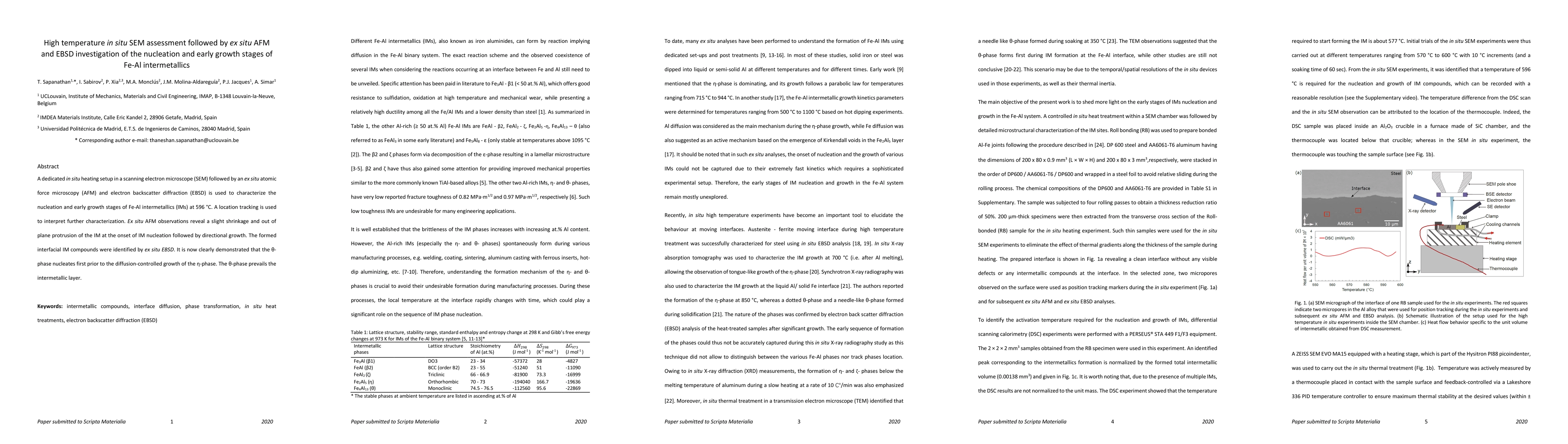This study uses in situ SEM to observe the nucleation and early growth of Fe-Al intermetallics at high temperatures, followed by ex situ AFM and EBSD to characterize the morphology and crystal structure. The findings show initial shrinkage and protrusion of the intermetallic phase, with the θ-phase nucleating first before the η-phase grows.