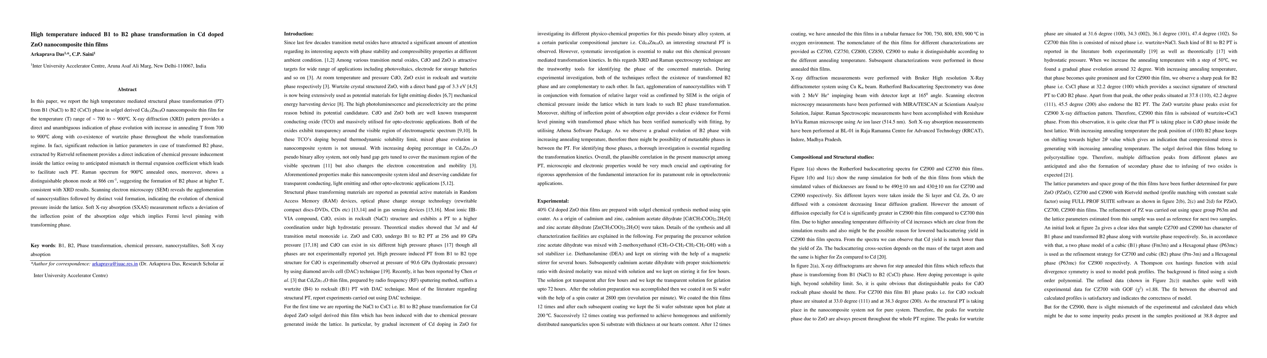 In this paper, we report the high temperature mediated structural phase transformation from B1 to B2 phase in solgel derived Cd0.2Zn0.8O nanocomposite thin film for the temperature range of 700 to 900 degree centigrade. Xray diffraction pattern provides a direct and unambiguous indication of phase evolution with increase in annealing Temperature from 700 to 900 degree centigrade along with coexistence of wurtzite phase throughout the whole transformation regime. In fact, significant reduction in lattice parameters in case of transformed B2 phase, extracted by Rietveld refinement provides a direct indication of chemical pressure inducement inside the lattice owing to anticipated mismatch in thermal expansion coefficient which leads to facilitate such phase transformation. Raman spectrum for 900 degree centigrade annealed ones, moreover, shows a distinguishable phonon mode at 866 centimeter inverse, suggesting the formation of B2 phase at higher temperature, consistent with XRD results. Scanning electron microscopy reveals the agglomeration of nanocrystallites followed by distinct void formation, indicating the evolution of chemical pressure inside the lattice. Soft Xray absorption measurement reflects a deviation of the inflection point of the absorption edge which implies Fermi level pinning with transforming phase.