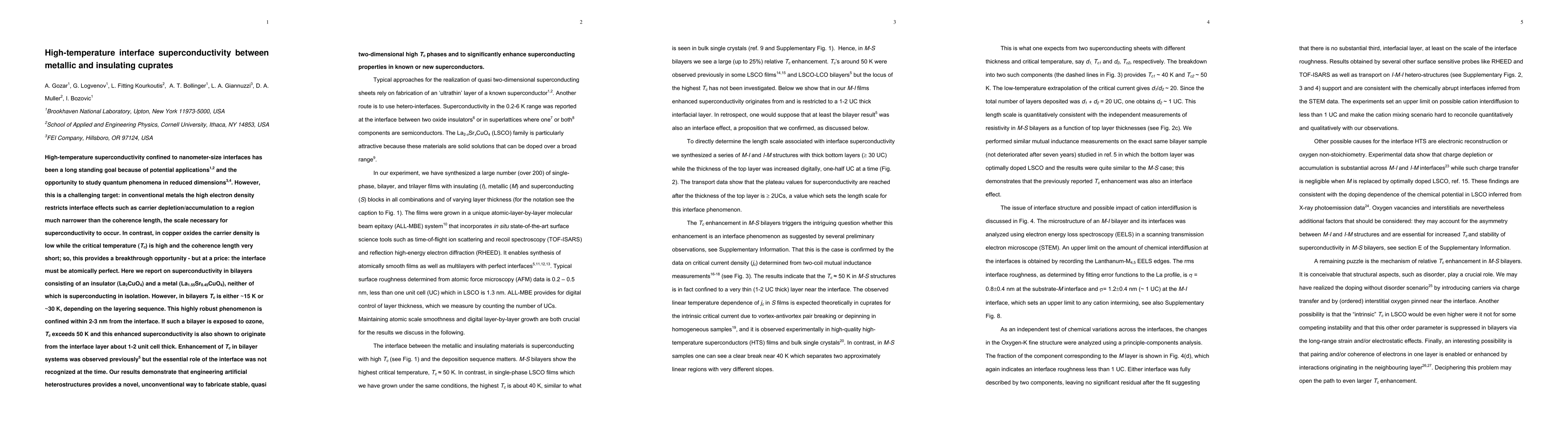 This paper reports high-temperature superconductivity at interfaces between metallic and insulating cuprates, achieving T_c up to 50 K. The study highlights the potential of engineered heterostructures to create stable, quasi two-dimensional high-temperature superconducting phases.