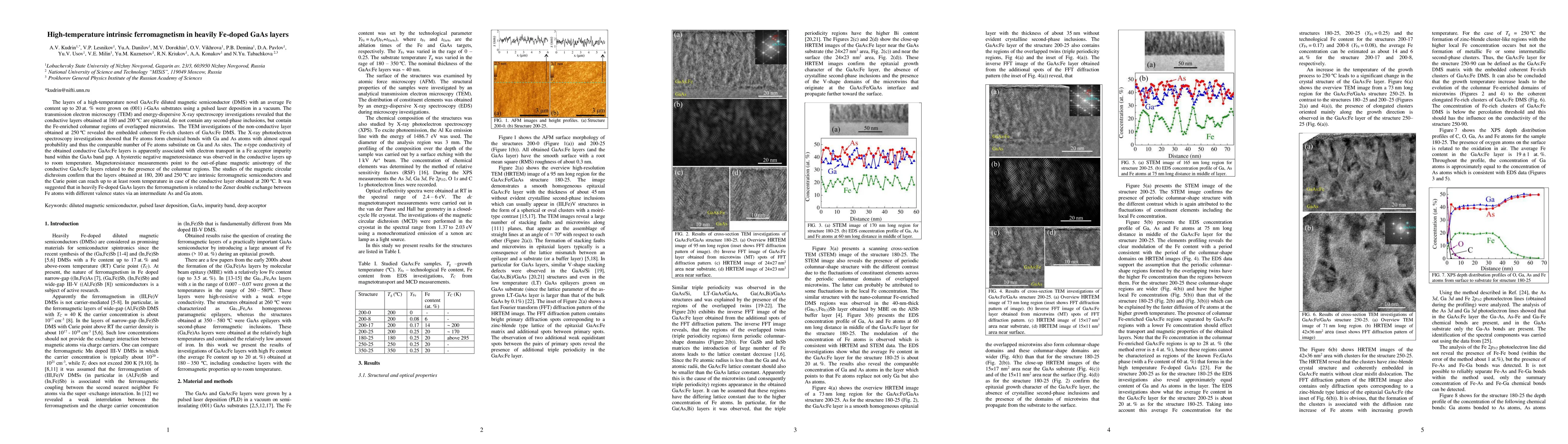 This study investigates heavily Fe-doped GaAs layers grown via pulsed laser deposition, revealing intrinsic ferromagnetism at high temperatures. The Fe atoms form bonds with Ga and As, and the material exhibits room-temperature ferromagnetism due to Zener double exchange between Fe atoms.