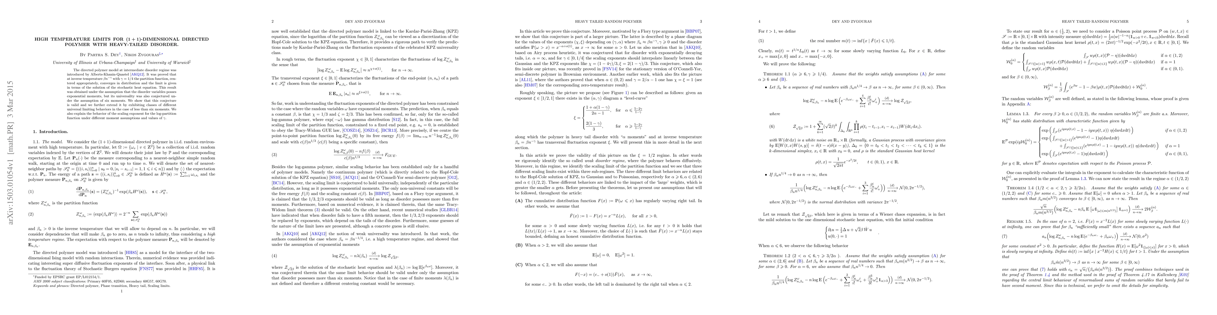 The directed polymer model at intermediate disorder regime was introduced by Alberts-Khanin-Quastel~\cite{AKQ12}. It was proved that at inverse temperature $\beta n^{-\gamma}$ with $\gamma=1/4$ the partition function, centered appropriately, converges in distribution and the limit is given in terms of the solution of the stochastic heat equation. This result was obtained under the assumption that the disorder variables posses exponential moments, but its universality was also conjectured under the assumption of six moments. We show that this conjecture is valid and we further extend it by exhibiting classes of different universal limiting behaviors in the case of less than six moments. We also explain the behavior of the scaling exponent for the log-partition function under different moment assumptions and values of $\gamma$.