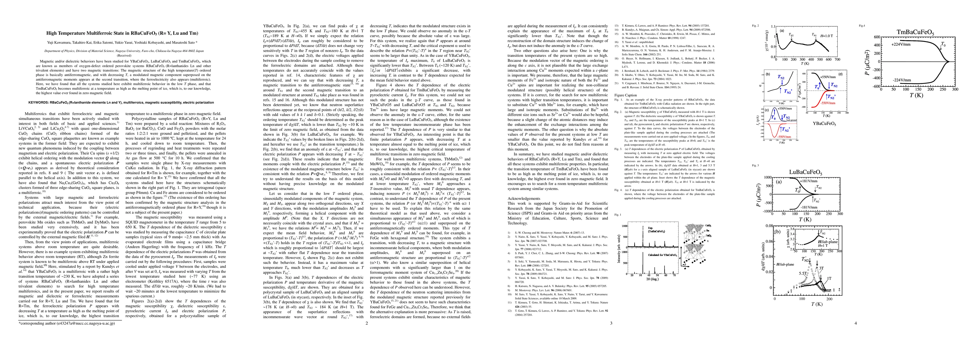 This study investigates the magnetic and dielectric properties of RBaCuFeO5 (R=Y, Lu, Tm) perovskite systems, revealing a high-temperature antiferromagnetic phase transitioning to a low-temperature multiferroic phase. Notably, TmBaCuFeO5 exhibits multiferroic behavior at a remarkably high temperature, the highest ever reported in zero magnetic field.