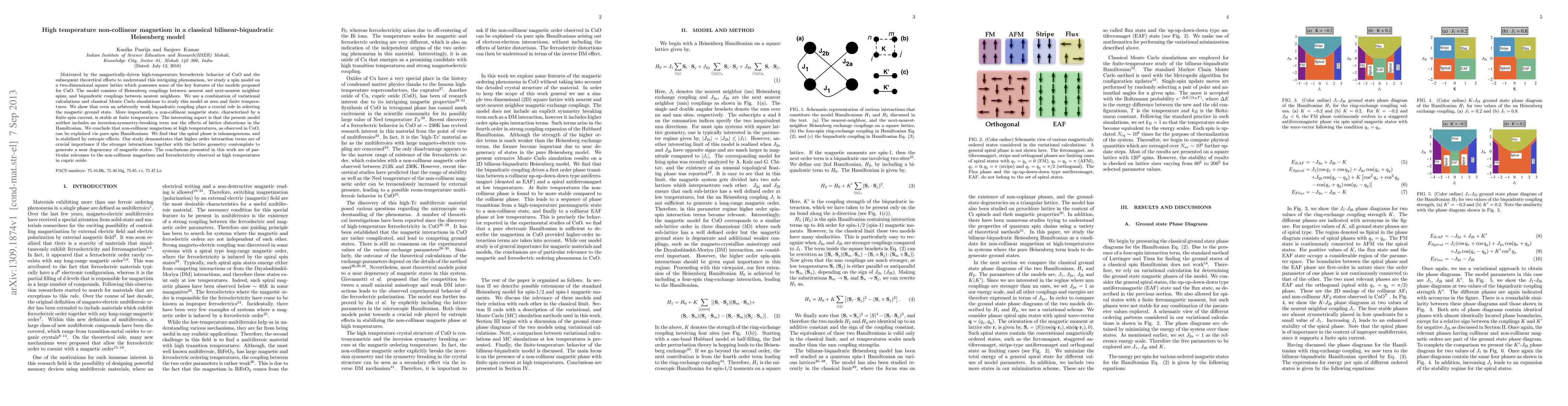Motivated by the magnetically-driven high-temperature ferroelectric behavior of CuO and the subsequent theoretical efforts to understand this intriguing phenomenon, we study a spin model on a two-dimensional square lattice which possesses some of the key features of the models proposed for CuO. The model consists of Heisenberg couplings between nearest and next-nearest neighbor spins, and biquadratic couplings between nearest neighbors. We use a combination of variational calculations and classical Monte Carlo simulations to study this model at zero and finite temperatures. We show that even an arbitrarily weak biquadratic coupling plays a crucial role in selecting the magnetic ground state. More importantly, a non-collinear magnetic state, characterized by a finite spin current, is stable at finite temperatures. The interesting aspect is that the present model neither includes an inversion-symmetry-breaking term nor the effects of lattice distortions in the Hamiltonian. We conclude that non-collinear magnetism at high temperatures, as observed in CuO, can be explained via pure spin Hamiltonians. We find that the spiral phase is inhomogeneous, and is stabilized by entropic effects. Our study demonstrates that higher order interaction terms are of crucial importance if the stronger interactions together with the lattice geometry contemplate to generate a near degeneracy of magnetic states. The conclusions presented in this work are of particular relevance to the non-collinear magnetism and ferroelectricity observed at high temperatures in cupric oxide.