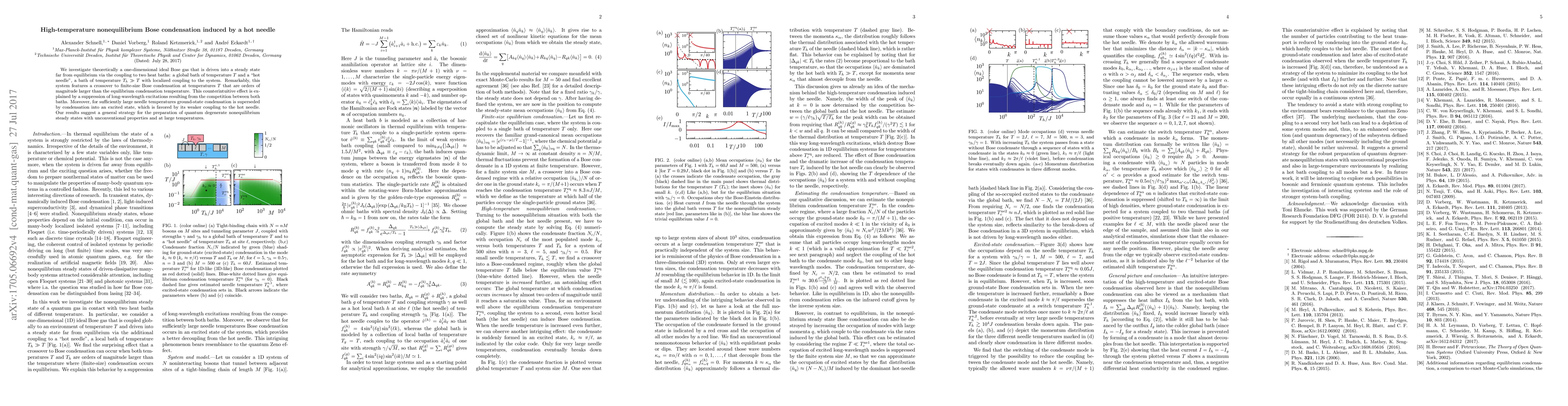 Researchers discovered a way to induce high-temperature Bose condensation in a one-dimensional gas by coupling it to two heat baths with different temperatures. This phenomenon can lead to unconventional quantum states at large temperatures.
