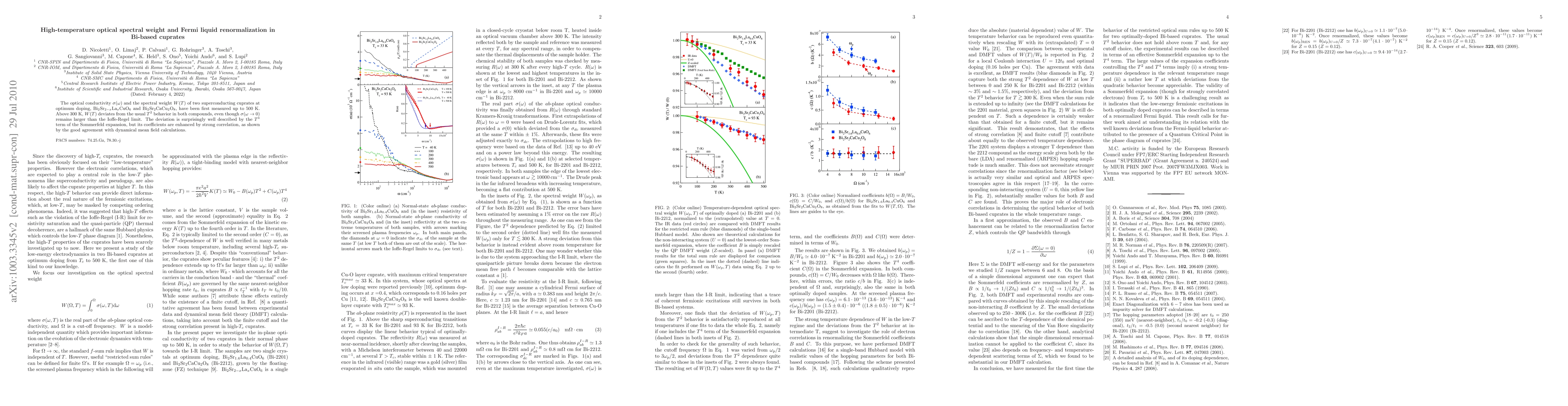 This paper investigates the optical conductivity and spectral weight of Bi-based cuprates at high temperatures, finding that above 300 K, the spectral weight deviates from T^2 behavior and aligns with a T^4 term, indicating strong correlation-driven Fermi liquid renormalization, corroborated by dynamical mean field theory calculations.