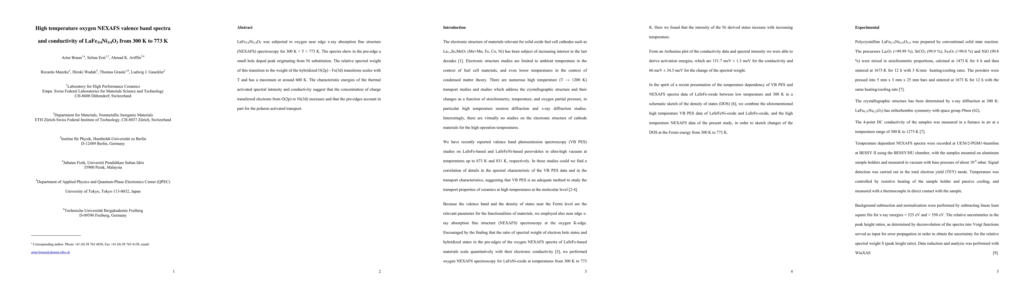 This study uses oxygen NEXAFS spectroscopy on LaFe3/4Ni1/4O3 from 300 K to 773 K, revealing a temperature-dependent pre-edge peak indicating Ni substitution. The peak's weight scales with temperature, peaking at 600 K, suggesting increased electron transfer from O to Ni and polaron-activated transport.