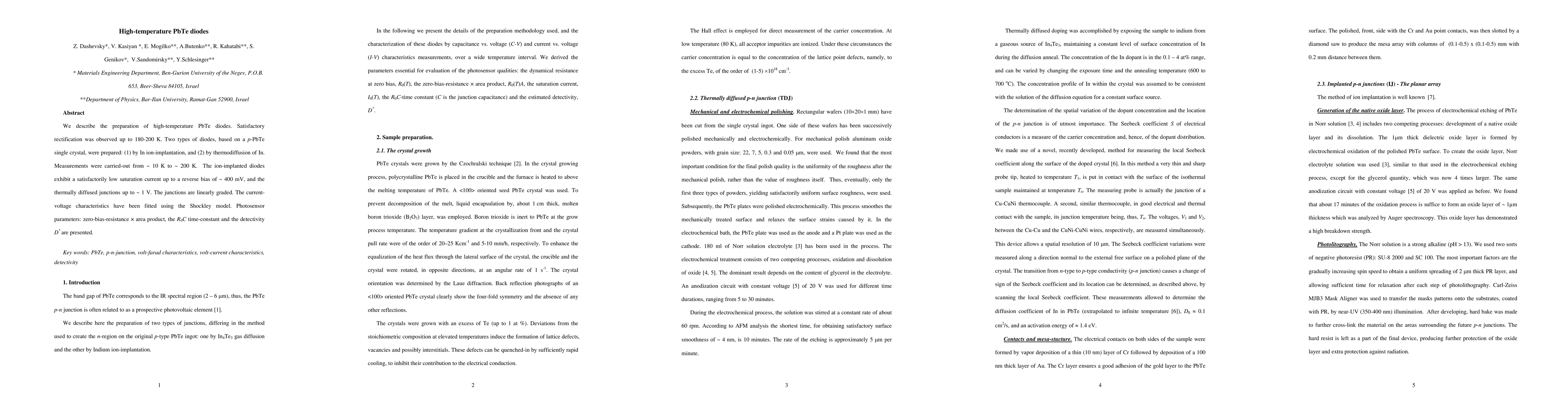 We describe the preparation of high-temperature PbTe diodes. Satisfactory rectification was observed up to 180-200 K. Two types of diodes, based on a p-PbTe single crystal, were prepared: (1) by In ion-implantation, and (2) by thermodiffusion of In. Measurements were carried-out from ~ 10 K to ~ 200 K. The ion-implanted diodes exhibit a satisfactorily low saturation current up to a reverse bias of ~ 400 mV, and the thermally diffused junctions up to ~ 1 V. The junctions are linearly graded. The current-voltage characteristics have been fitted using the Shockley model. Photosensor parameters: zero-bias-resistance x area product, the R0C time constant and the detectivity D* are presented.