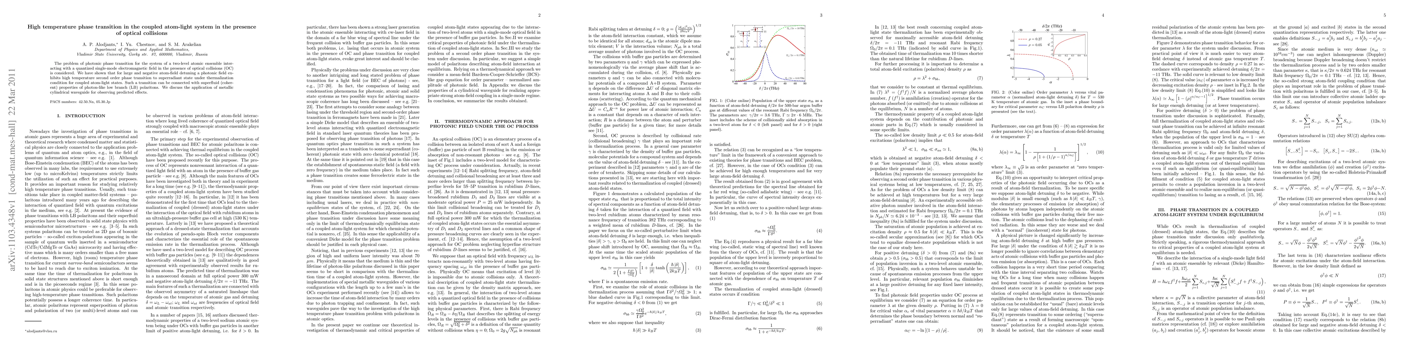 This paper investigates the photonic phase transition in a coupled atom-light system with optical collisions, demonstrating a high-temperature second-order transition to a superradiant state under specific conditions. The study suggests that this transition relates to superfluid properties of photon-like polaritons and proposes the use of metallic cylindrical waveguides to observe these effects.