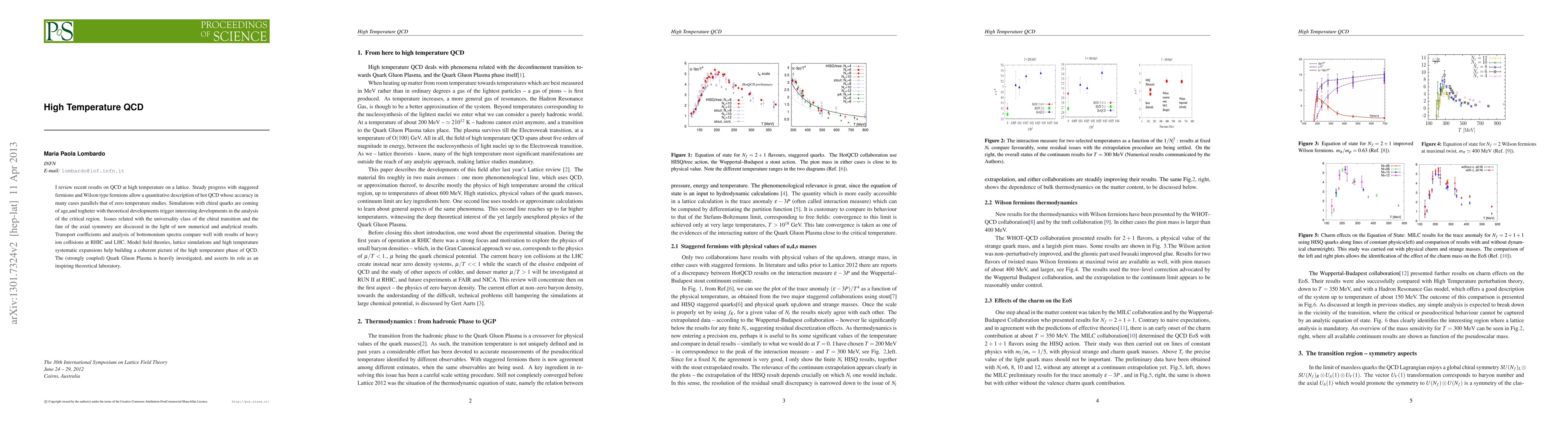 I review recent results on QCD at high temperature on a lattice. Steady progress with staggered fermions and Wilson type fermions allow a quantitative description of hot QCD whose accuracy in many cases parallels that of zero temperature studies. Simulations with chiral quarks are coming of age, and togheter with theoretical developments trigger interesting developments in the analysis of the critical region. Issues related with the universality class of the chiral transition and the fate of the axial symmetry are discussed in the light of new numerical and analytical results. Transport coefficients and analysis of bottomonium spectra compare well with results of heavy ion collisions at RHIC and LHC. Model field theories, lattice simulations and high temperature systematic expansions help building a coherent picture of the high temperature phase of QCD. The (strongly coupled) Quark Gluon Plasma is heavily investigated, and asserts its role as an inspiring theoretical laboratory.