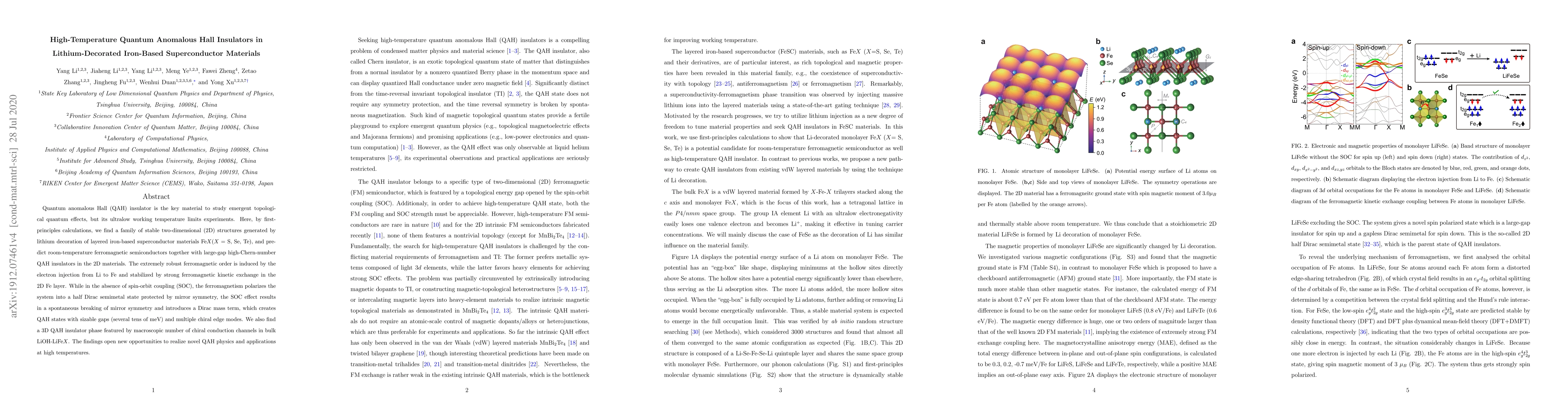 This research identifies stable 2D structures formed by lithium decoration of iron-based superconductors, predicting room-temperature ferromagnetic semiconductors with large-gap quantum anomalous Hall insulators. The study reveals that the ferromagnetic order and topological states are stabilized by electron injection and strong kinetic exchange, offering new pathways for high-temperature quantum anomalous Hall physics.