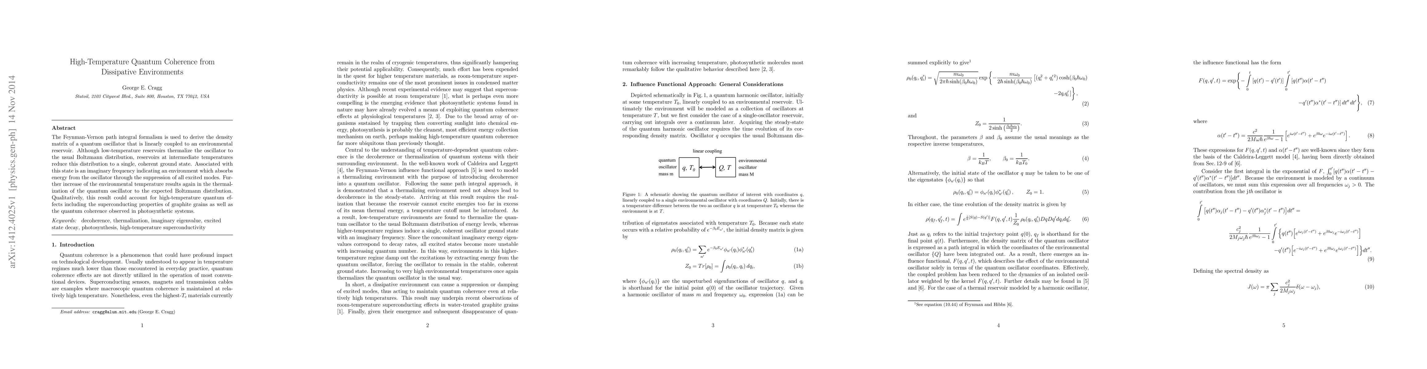 The Feynman-Vernon path integral formalism is used to derive the density matrix of a quantum oscillator that is linearly coupled to an environmental reservoir. Although low-temperature reservoirs thermalize the oscillator to the usual Boltzmann distribution, reservoirs at intermediate temperatures reduce this distribution to a single, coherent ground state. Associated with this state is an imaginary frequency indicating an environment which absorbs energy from the oscillator through the suppression of all excited modes. Further increase of the environmental temperature results again in the thermalization of the quantum oscillator to the expected Boltzmann distribution. Qualitatively, this result could account for high-temperature quantum effects including the superconducting properties of graphite grains as well as the quantum coherence observed in photosynthetic systems.