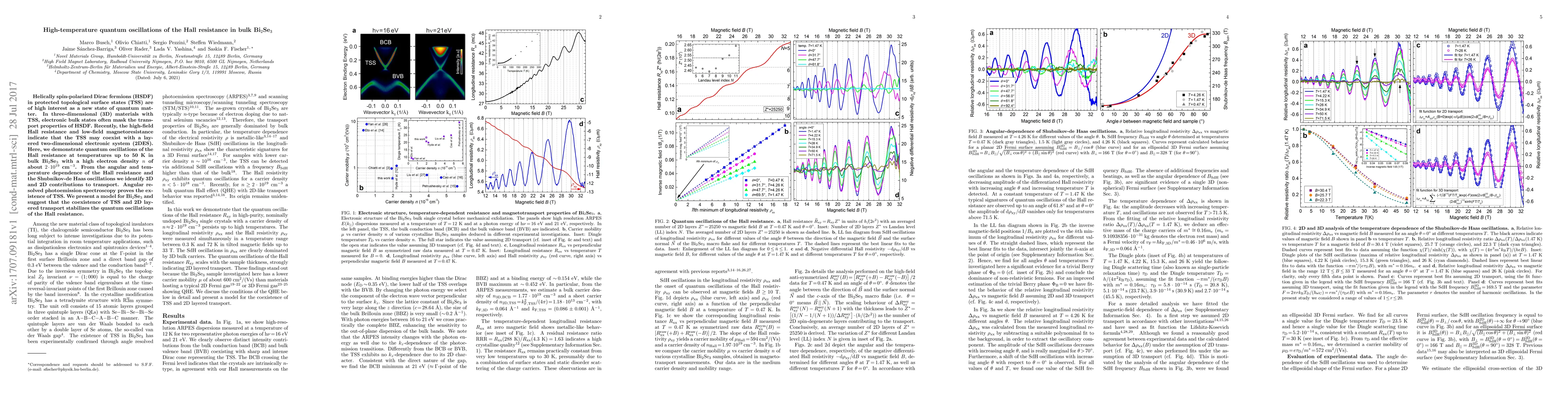 Researchers demonstrate quantum oscillations of Hall resistance at high temperatures in bulk Bi2Se3, indicating coexistence with a 2D electronic system and topological surface states.