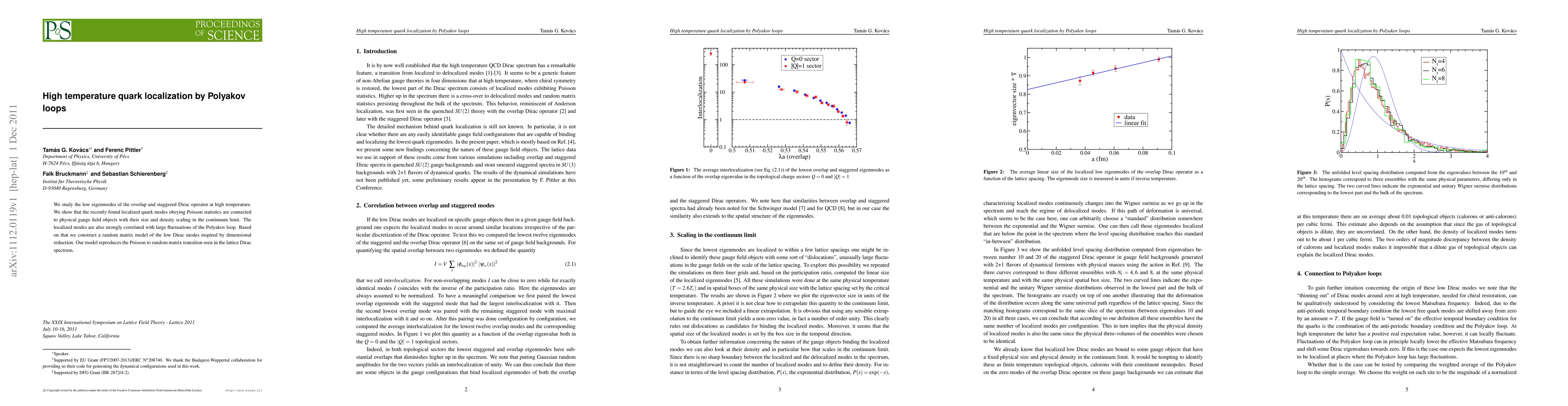 We study the low eigenmodes of the overlap and staggered Dirac operator at high temperature. We show that the recently found localized quark modes obeying Poisson statistics are connected to physical gauge field objects with their size and density scaling in the continuum limit. The localized modes are also strongly correlated with large fluctuations of the Polyakov loop. Based on that we construct a random matrix model of the low Dirac modes inspired by dimensional reduction. Our model reproduces the Poisson to random matrix transition seen in the lattice Dirac spectrum.