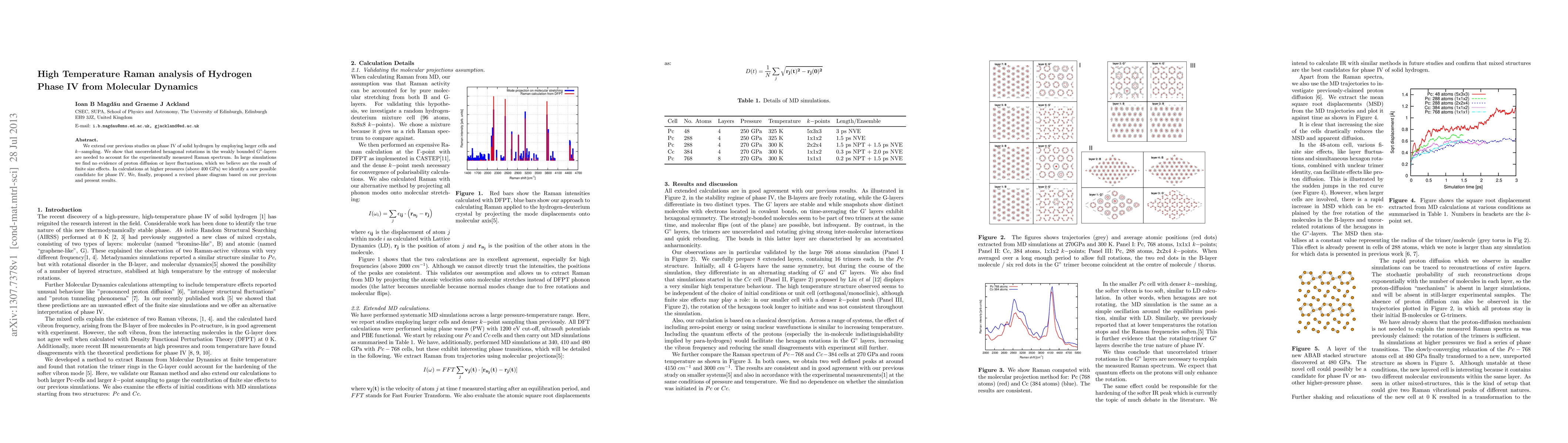 This study refines the understanding of phase IV of solid hydrogen through enhanced molecular dynamics simulations, revealing that hexagonal rotations in G"-layers explain the Raman spectrum. No proton diffusion or layer fluctuations are observed, suggesting these effects are due to finite size limitations.