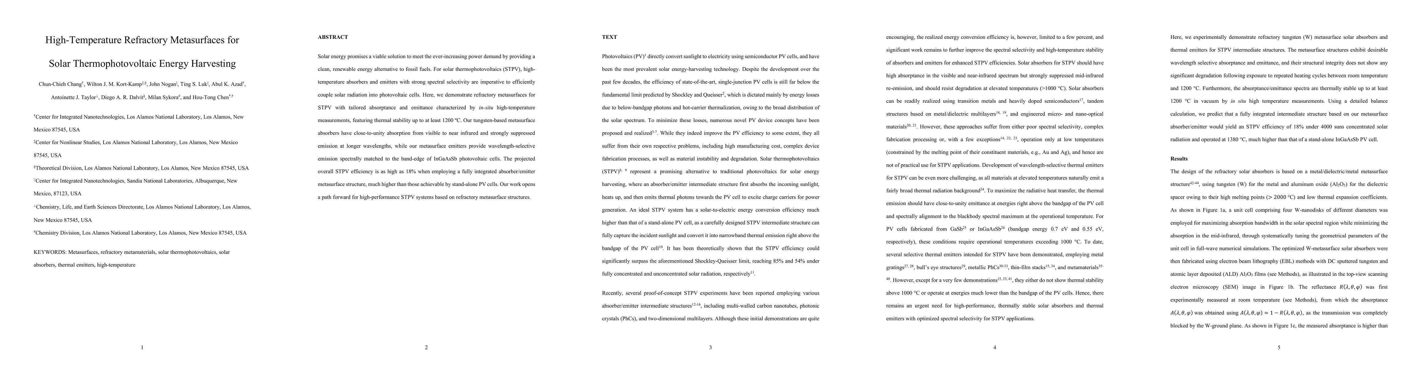 This paper presents refractory metasurfaces for solar thermophotovoltaic energy harvesting, achieving high-temperature stability up to 1200°C. The tungsten-based metasurfaces exhibit near-unity absorption and selective emission, projecting an overall STPV efficiency of 18%, significantly surpassing standalone PV cells.