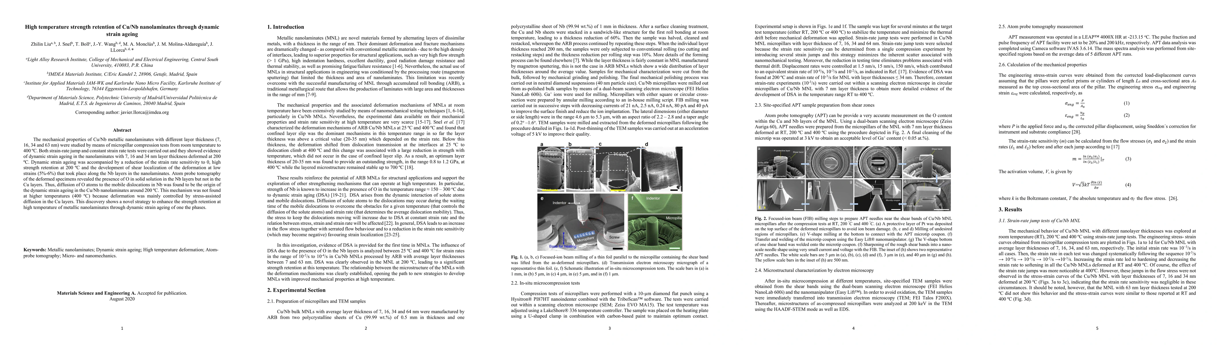 The study investigates high-temperature strength retention in Cu/Nb nanolaminates via dynamic strain aging (DSA), utilizing in situ compression tests on micropillars with varying layer thicknesses and temperatures.