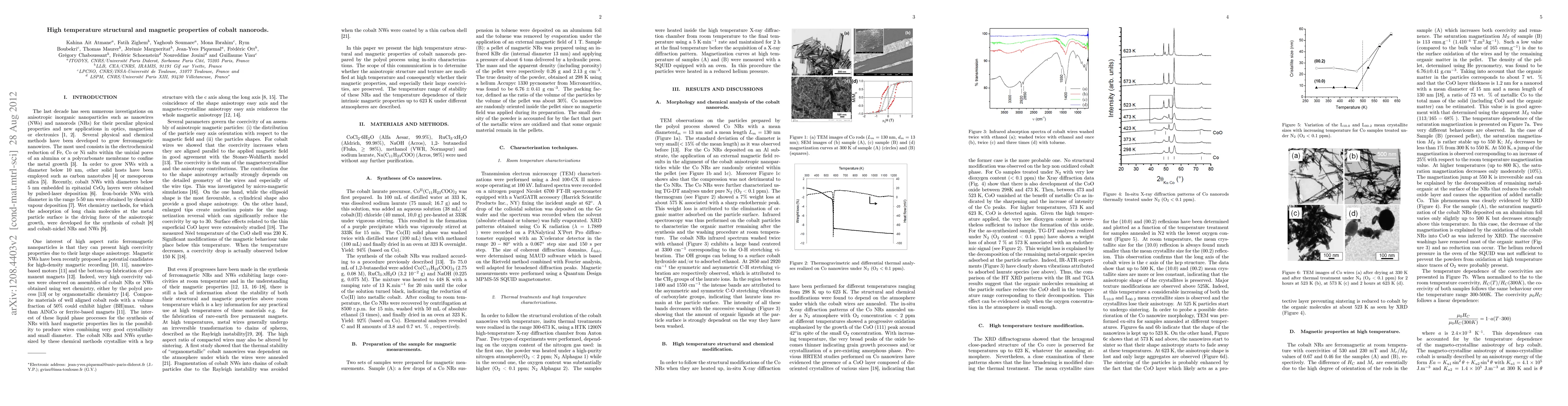 We present in this paper the structural and magnetic properties of high aspect ratio Co nanoparticles (~10) at high temperatures (up to 623 K) using in situ X ray diffraction (XRD) and SQUID characterizations. We show that the anisotropic shapes, the structural and texture properties are preserved up to 500 K. The coercivity can be modelled by u0Hc=2(Kmc+Kshape)/Ms with Kmc the magnetocrystalline anisotropy constant, Kshape the shape anisotropy constant and Ms the saturation magnetization. Hc decreases linearly when the temperature is increased due to the loss of the Co magnetocrystalline anisotropy contribution. At 500K, 50% of the room temperature coercivity is preserved corresponding to the shape anisotropy contribution only. We show that the coercivity drop is reversible in the range 300 - 500 K in good agreement with the absence of particle alteration. Above 525 K, the magnetic properties are irreversibly altered either by sintering or by oxidation.