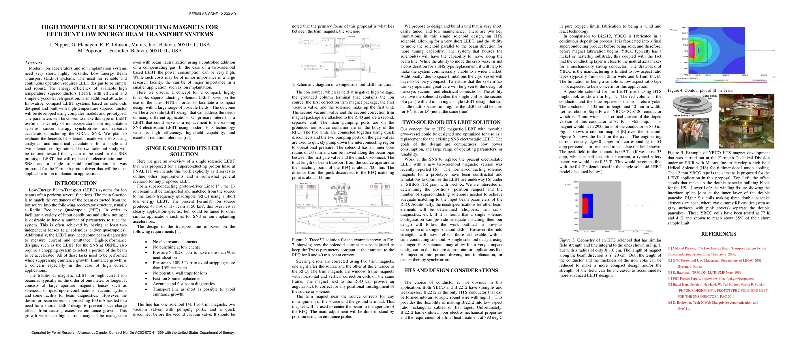 Modern ion accelerators and ion implantation systems need very short, highly versatile, Low Energy Beam Transport (LEBT) systems. The need for reliable and continuous operation requires LEBT designs to be simple and robust. The energy efficiency of available high temperature superconductors (HTS), with efficient and simple cryocooler refrigeration, is an additional attraction. Innovative, compact LEBT systems based on solenoids designed and built with high-temperature superconductor will be developed using computer models and prototyped. The parameters will be chosen to make this type of LEBT useful in a variety of ion accelerators, ion implantation systems, cancer therapy synchrotrons, and research accelerators, including the ORNL SNS. The benefits of solenoids made with HTS will be evaluated with analytical and numerical calculations for a two-solenoid configuration, as will be used in the SNS prototype LEBT that will replace the electrostatic one at SNS, and a single solenoid configuration, as was proposed for the Fermilab proton driver that will be most applicable to ion implantation applications.