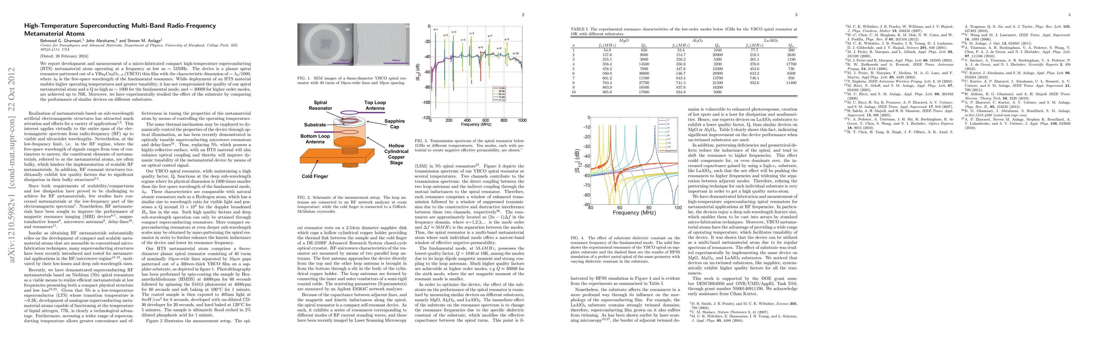 We report development and measurement of a micro-fabricated compact high-temperature superconducting (HTS) metamaterial atom operating at a frequency as low as $\sim$ 53MHz. The device is a planar spiral resonator patterned out of a {YBa$_2$Cu$_3$O$_{7-\delta}$} (YBCO) thin film with the characteristic dimension of $\sim \lambda_0/1000$, where $\lambda_0$ is the free-space wavelength of the fundamental resonance. While deployment of an HTS material enables higher operating temperatures and greater tunability, it has not compromised the quality of our spiral metamaterial atom and a Q as high as $\sim 1000$ for the fundamental mode, and $\sim 30000$ for higher order modes, are achieved up to 70K. Moreover, we have experimentally studied the effect of the substrate by comparing the performance of similar devices on different substrates.