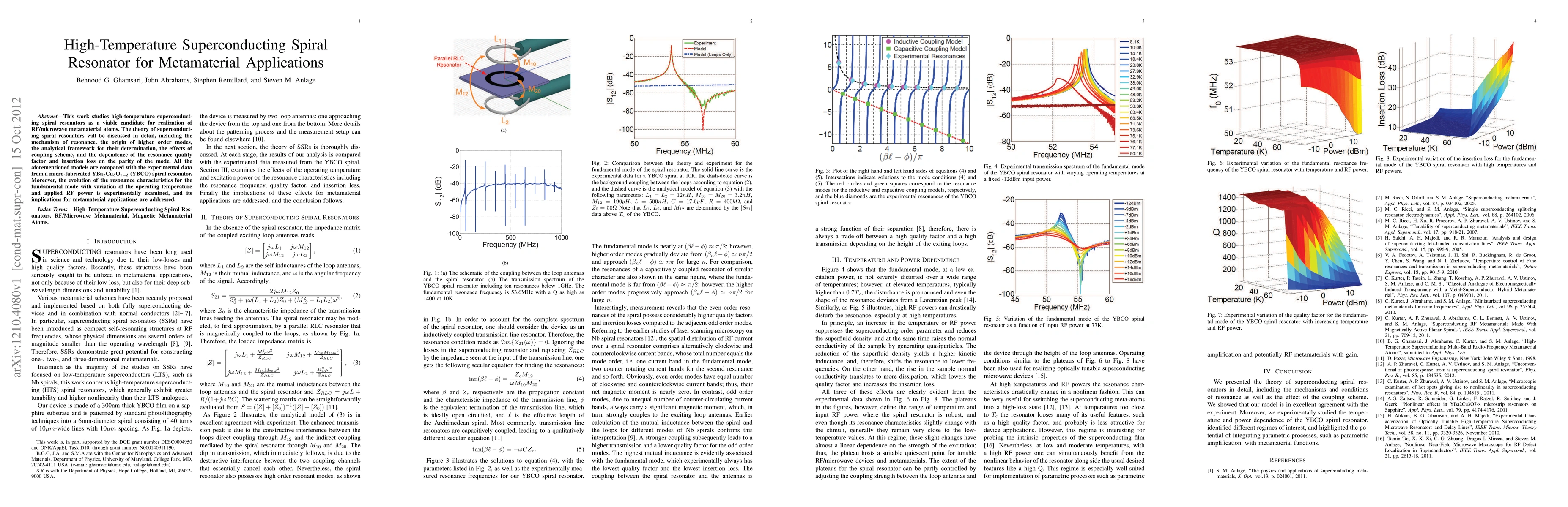 This paper investigates high-temperature superconducting spiral resonators for RF/microwave metamaterial applications, detailing their resonance mechanisms and coupling effects, and comparing theoretical models with experimental data from YBa$_2$Cu$_3$O$_{7-\delta}$ (YBCO) resonators. The study also examines how temperature and RF power affect resonance characteristics, relevant for metamaterial applications.