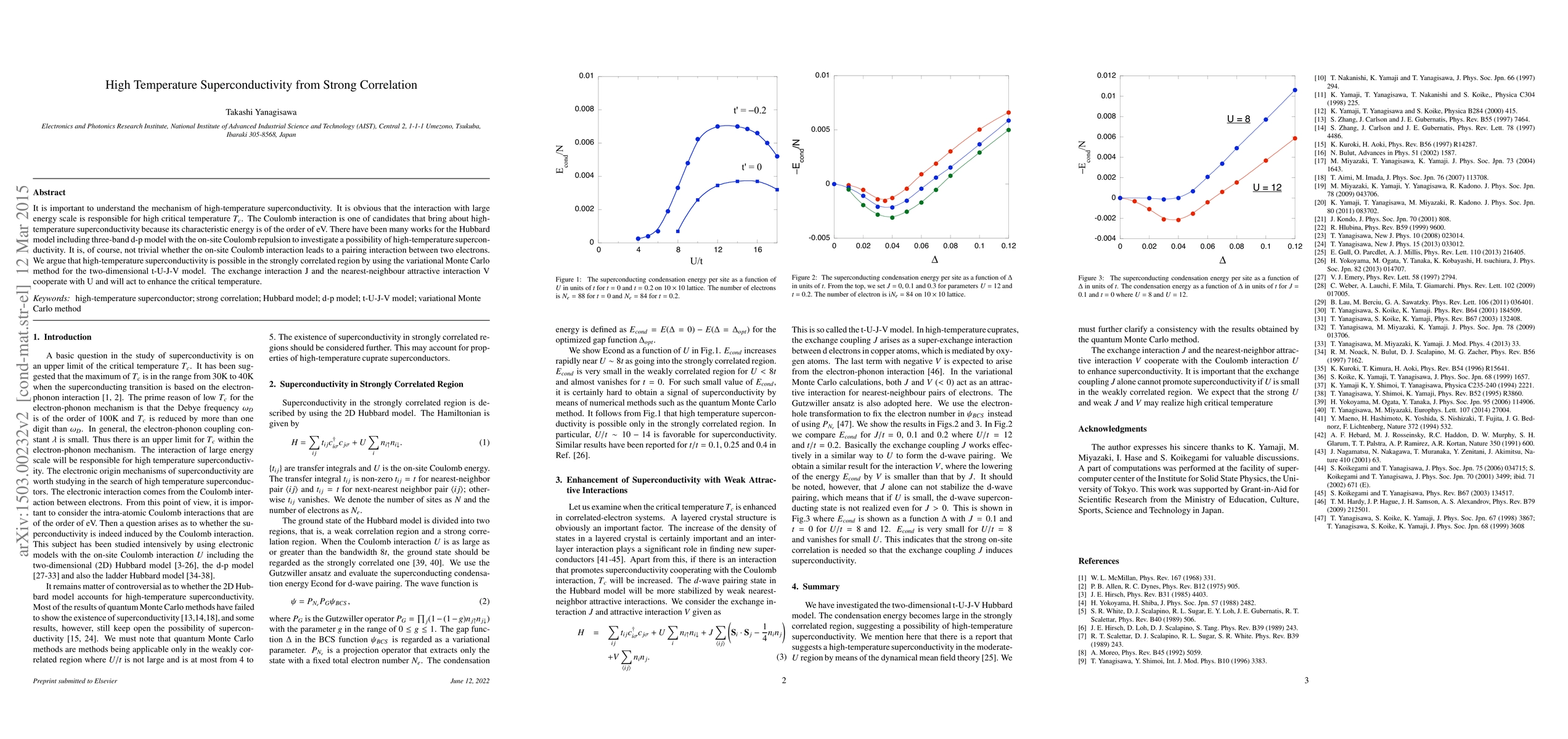 This paper investigates the potential of high-temperature superconductivity through strong electron correlation, particularly the role of on-site Coulomb interaction in the t-U-J-V model. Using variational Monte Carlo methods, it demonstrates that the interplay of exchange interaction and nearest-neighbor attractive interaction can enhance critical temperature $T_c$.