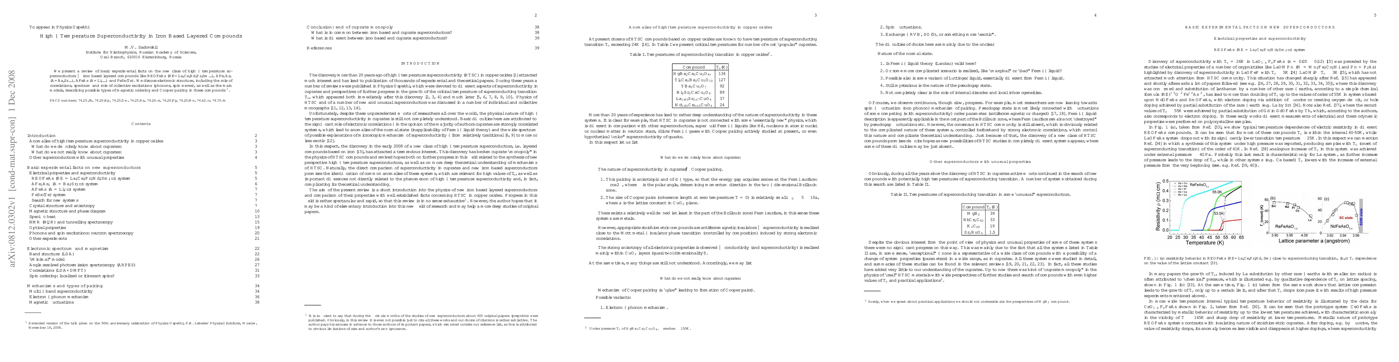The paper presents a review of experimental facts on high-temperature superconductors in iron-based layered compounds, discussing electronic structure, correlations, spectrum, and collective excitations. It covers compounds like REOFeAs, AFe_2As_2, AFeAs, and FeSe(Te).