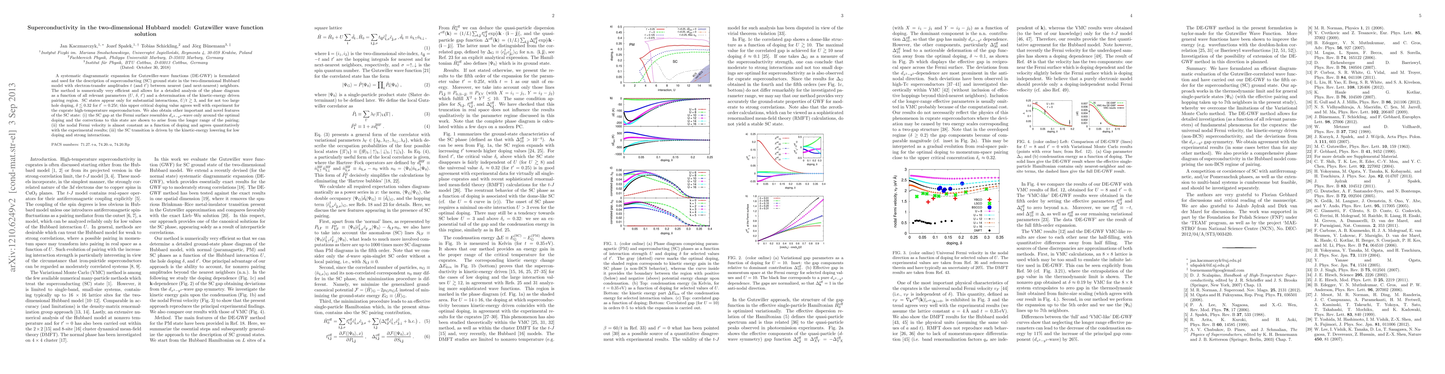 A systematic diagrammatic expansion for Gutzwiller-wave functions (DE-GWF) is formulated and used for the description of superconducting (SC) ground state in the two-dimensional Hubbard model with electron-transfer amplitudes t (and t') between nearest (and next-nearest) neighbors. The method is numerically very efficient and allows for a detailed analysis of the phase diagram as a function of all relevant parameters (U, \delta, t') and a determination of the kinetic-energy driven pairing region. SC states appear only for substantial interactions, U/t > 3, and for not too large hole doping, \delta < 0.32 for t' = 0.25 t; this upper critical doping value agrees well with experiment for the cuprate high-temperature superconductors. We also obtain other important features of the SC state: (i) the SC gap at the Fermi surface resembles $d_{x^2-y^2}$-wave only around the optimal doping and the corrections to this state are shown to arise from the longer range of the pairing; (ii) the nodal Fermi velocity is almost constant as a function of doping and agrees quantitatively with the experimental results; (iii) the SC transition is driven by the kinetic-energy lowering for low doping and strong interactions.