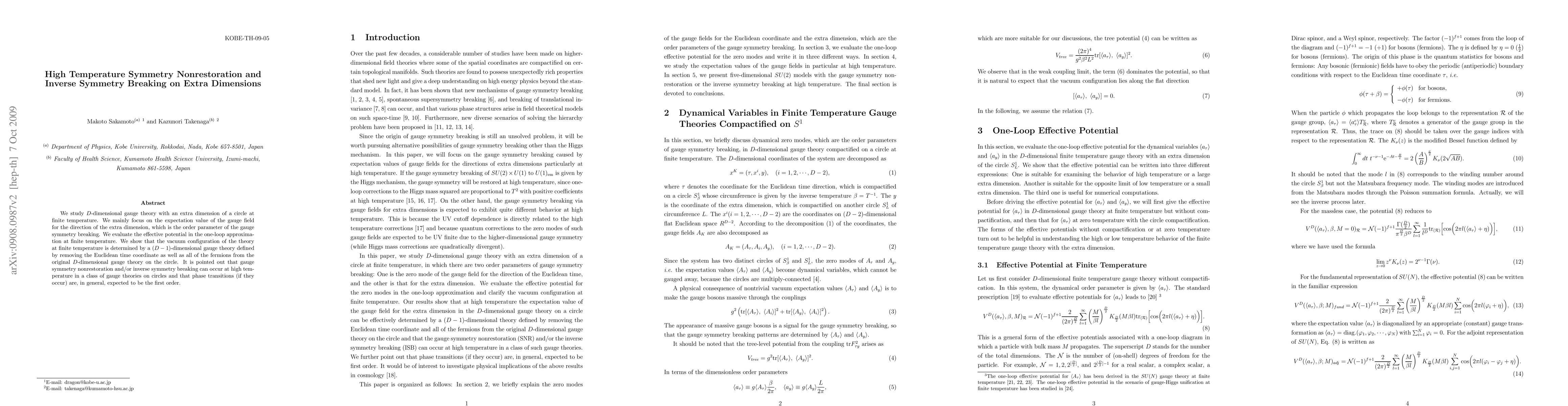 This paper investigates $D$-dimensional gauge theory with an extra circle dimension at finite temperature, focusing on the gauge field's expectation value as an order parameter. It demonstrates that high-temperature vacuum configurations are governed by a $(D-1)$-dimensional gauge theory, revealing potential for symmetry nonrestoration and inverse symmetry breaking, with first-order phase transitions likely.