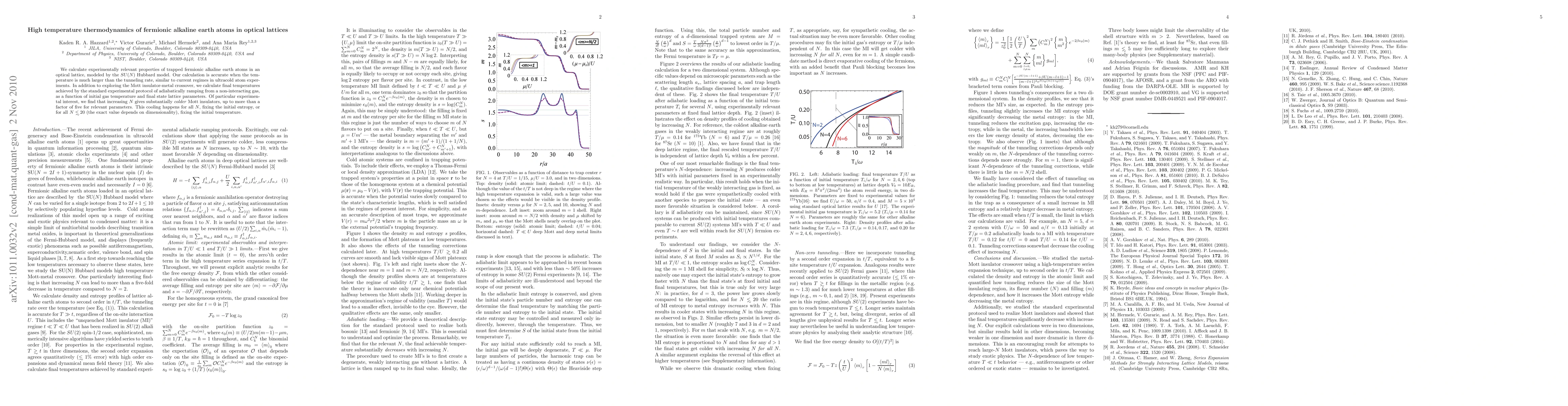 Summary: This paper investigates the high-temperature thermodynamics of fermionic alkaline earth atoms in optical lattices, finding that increasing the atomic species' complexity (N) results in significantly cooler Mott insulators, potentially up to five times colder, depending on parameters. This cooling is relevant for understanding current ultracold atom experiment conditions.