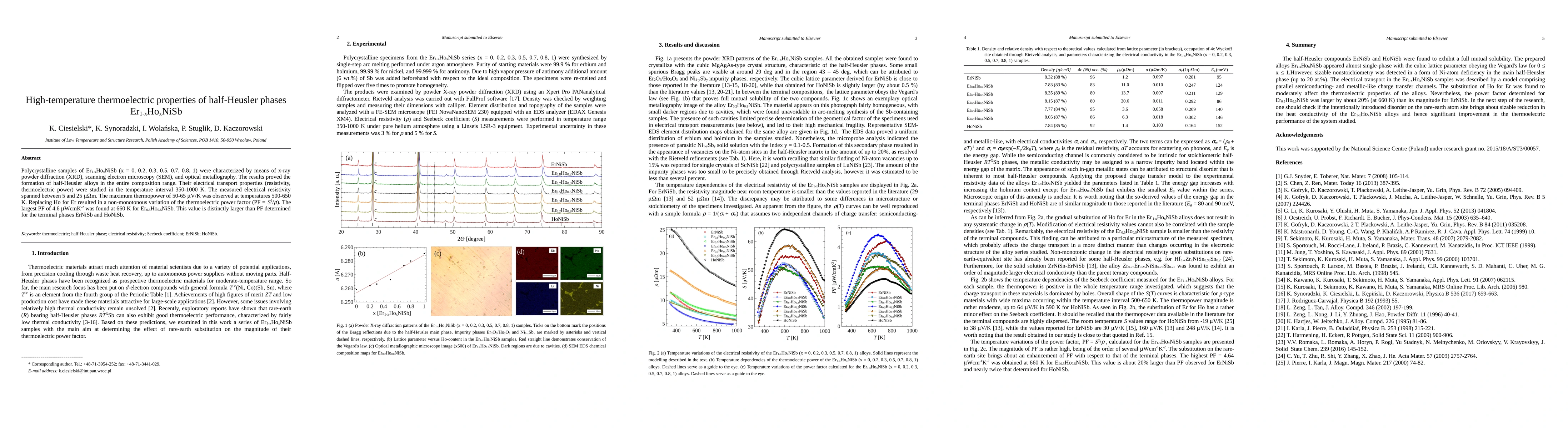 Polycrystalline samples of Er$_{1-x}$Ho$_x$NiSb ($x$ = 0, 0.2, 0.3, 0.5, 0.7, 0.8, 1) were characterized by means of x-ray powder diffraction (XRD), scanning electron microscopy (SEM), and optical metallography. The results proved the formation of half-Heusler alloys in the entire composition range. Their electrical transport properties (resistivity, thermoelectric power) were studied in the temperature interval 350-1000 K. The measured electrical resistivity spanned between 5 and 25 $\mu \Omega$m. The maximum thermopower of 50-65 $\mu$V/K was observed at temperatures 500-650 K. Replacing Ho for Er resulted in a non-monotonous variation of the thermoelectric power factor ($PF = S^2/\rho$). The largest $PF$ of 4.6 $\mu$WcmK$^{-2}$ was found at 660 K for Er$_{0.5}$Ho$_{0.5}$NiSb. This value is distinctly larger than PF determined for the terminal phases ErNiSb and HoNiSb.