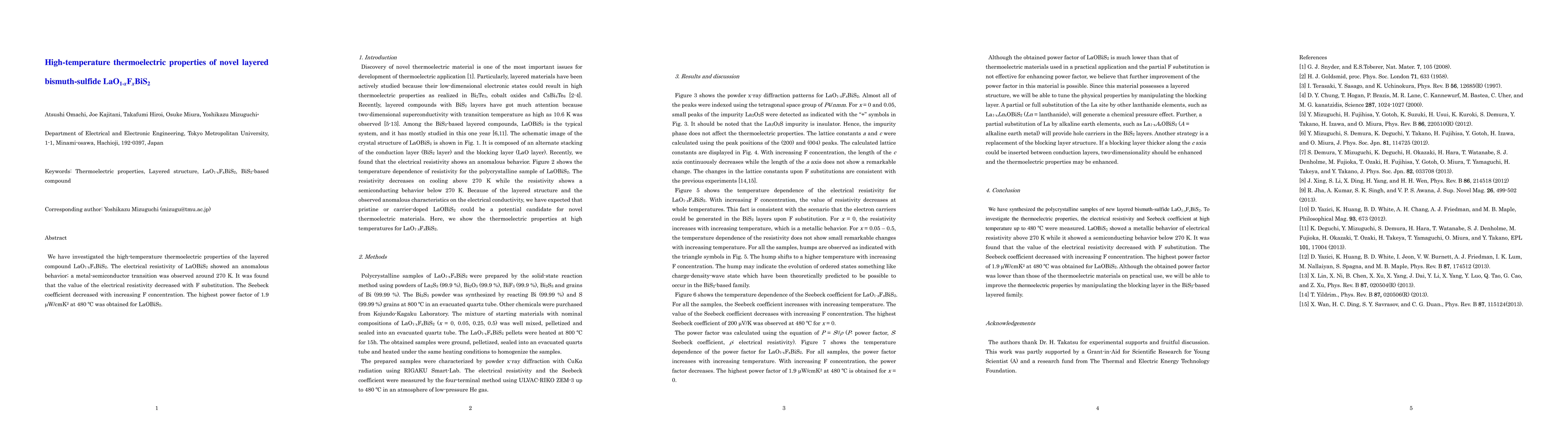 We have investigated the high-temperature thermoelectric properties of the layered compound LaO1-xFxBiS2. The electrical resistivity of LaOBiS2 showed an anomalous behavior; a metal-semiconductor transition was observed around 270 K. It was found that the value of the electrical resistivity decreased with F substitution. The Seebeck coefficient decreased with increasing F concentration. The highest power factor of 1.9 W/cmK2 at 480 C was obtained for LaOBiS2.
