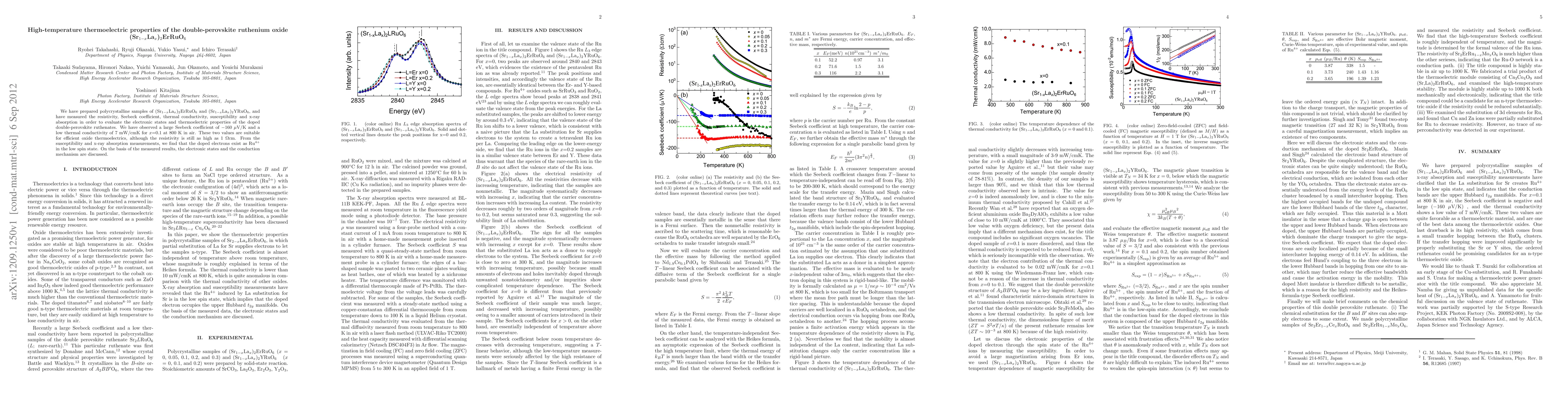 This study investigates the high-temperature thermoelectric properties of doped double-perovskite ruthenates, finding a large Seebeck coefficient and low thermal conductivity, indicating potential for efficient oxide thermoelectrics despite high resistivity. Electrons are identified as Ru$^{4+}$ in the low spin state based on susceptibility and x-ray absorption.