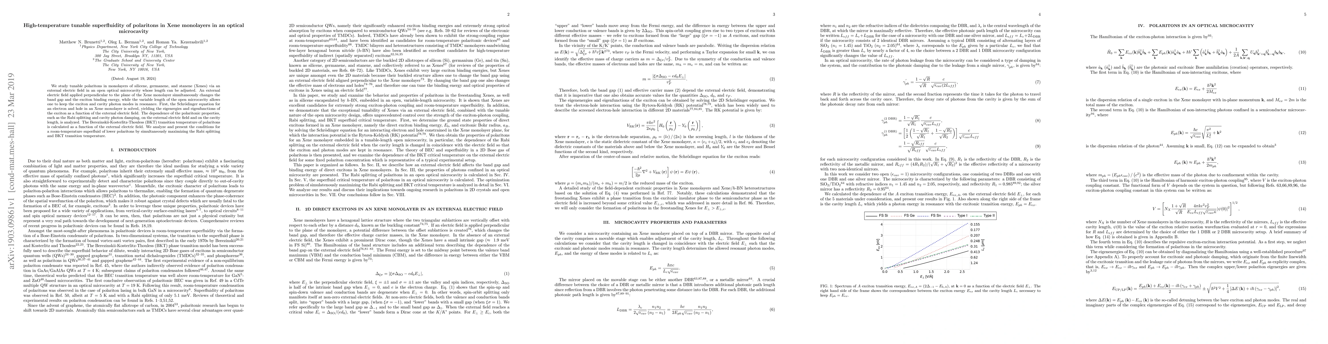 This research investigates the tunable superfluidity of polaritons in Xene monolayers (silicene, germanene, stanene) within an optical microcavity, where an external electric field adjusts the band gap and exciton binding energy. The study finds conditions for achieving room-temperature superfluidity by optimizing the Rabi splitting and Berezinskii-Kosterlitz-Thouless transition temperature.