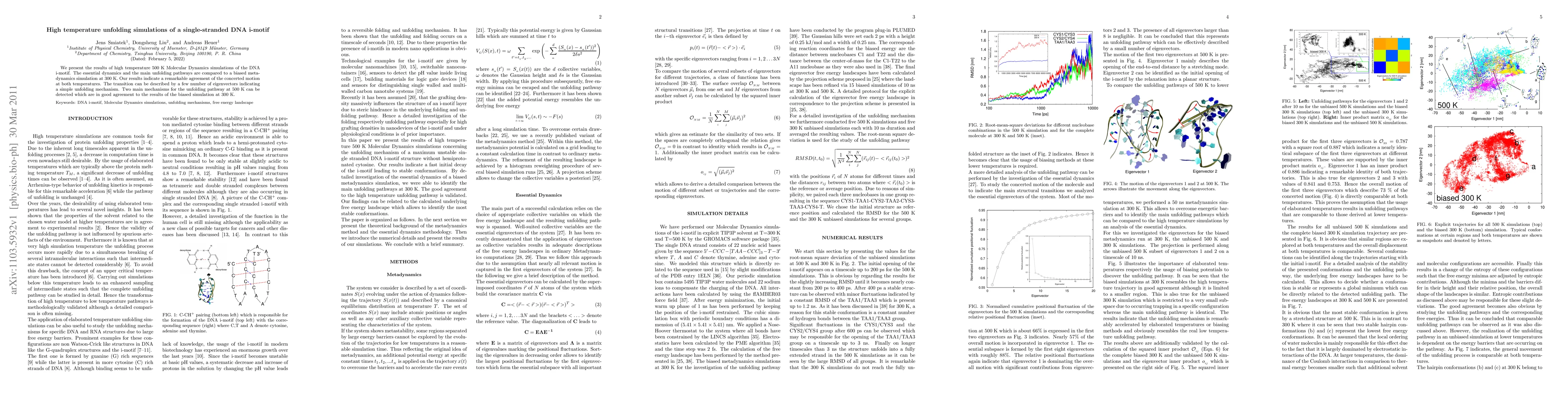 We present the results of high temperature 500 K Molecular Dynamics simulations of the DNA i-motif. The essential dynamics and the main unfolding pathways are compared to a biased metadynamics simulation at 300 K. Our results indicate a remarkable agreement of the concerted motion at both temperatures. The transition can be described by a few number of eigenvectors indicating a simple unfolding process. Two main mechanisms for the unfolding pathway at 500 K can be detected which are in good agreement to the results of the biased simulation at 300 K.